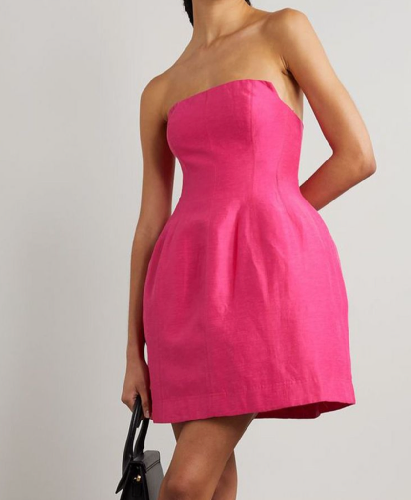 Description: Crafted from a luxe linen blend, this strapless mini features a sculpted, fitted bodice that cinches the waist before flaring into a voluminous skirt with subtle pleats for architectural drama.