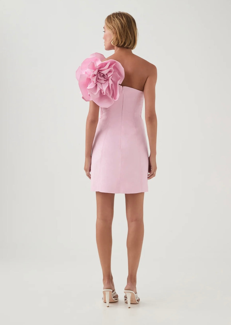 Description: Crafted in a soft pink blush hue, this structured mini dress features a striking one-shoulder neckline adorned with an oversized sculptural floral applique. The clean, fitted silhouette flatters the figure while maintaining a chic and modern edge.