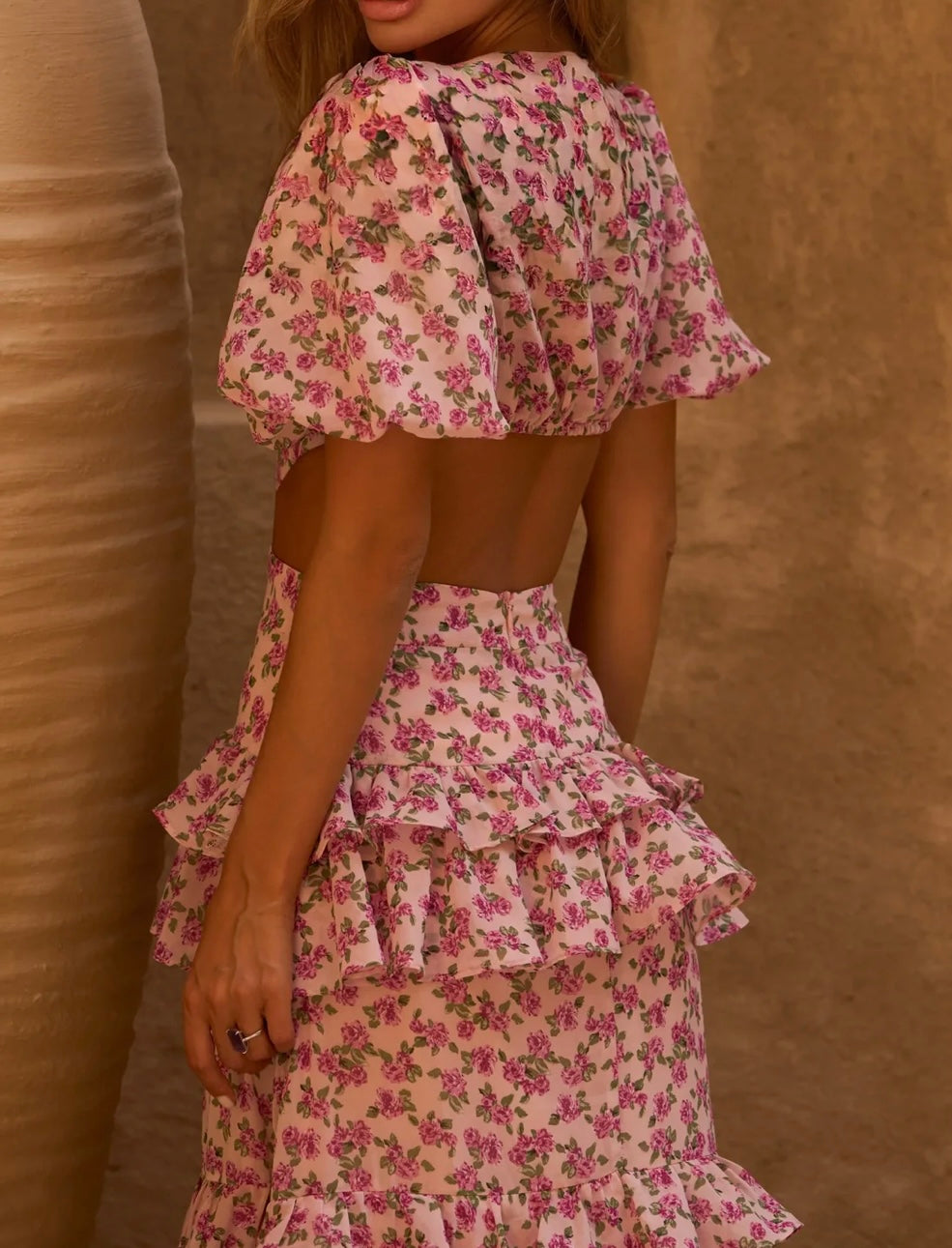 Description: Featuring delicate ruffled accents and cut-out detailing, this luxurious piece showcases a bespoke hand drawn print. Elevate any occasion with this sophisticated and elegant design. Perfect for spring/ summer parties and weddings!