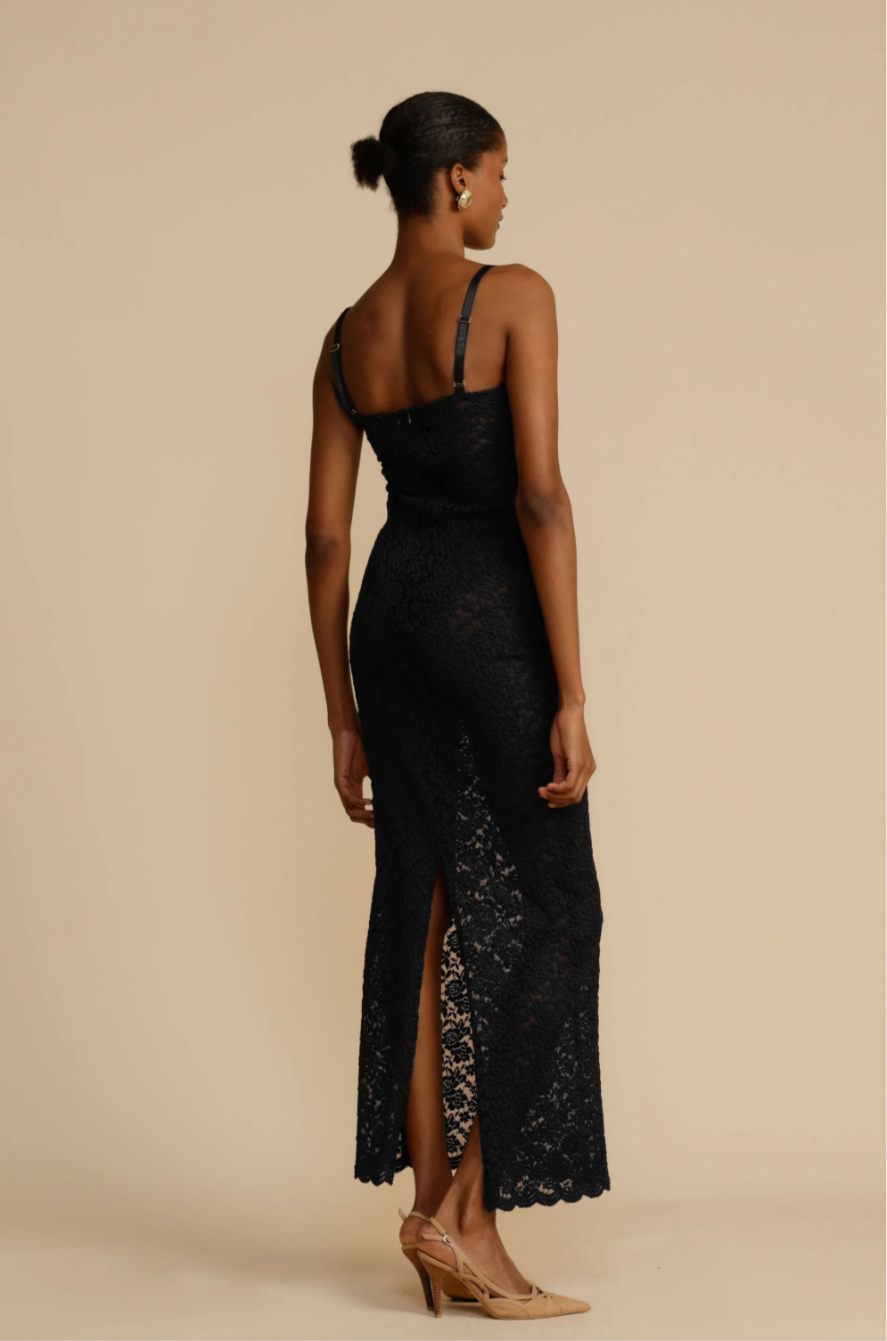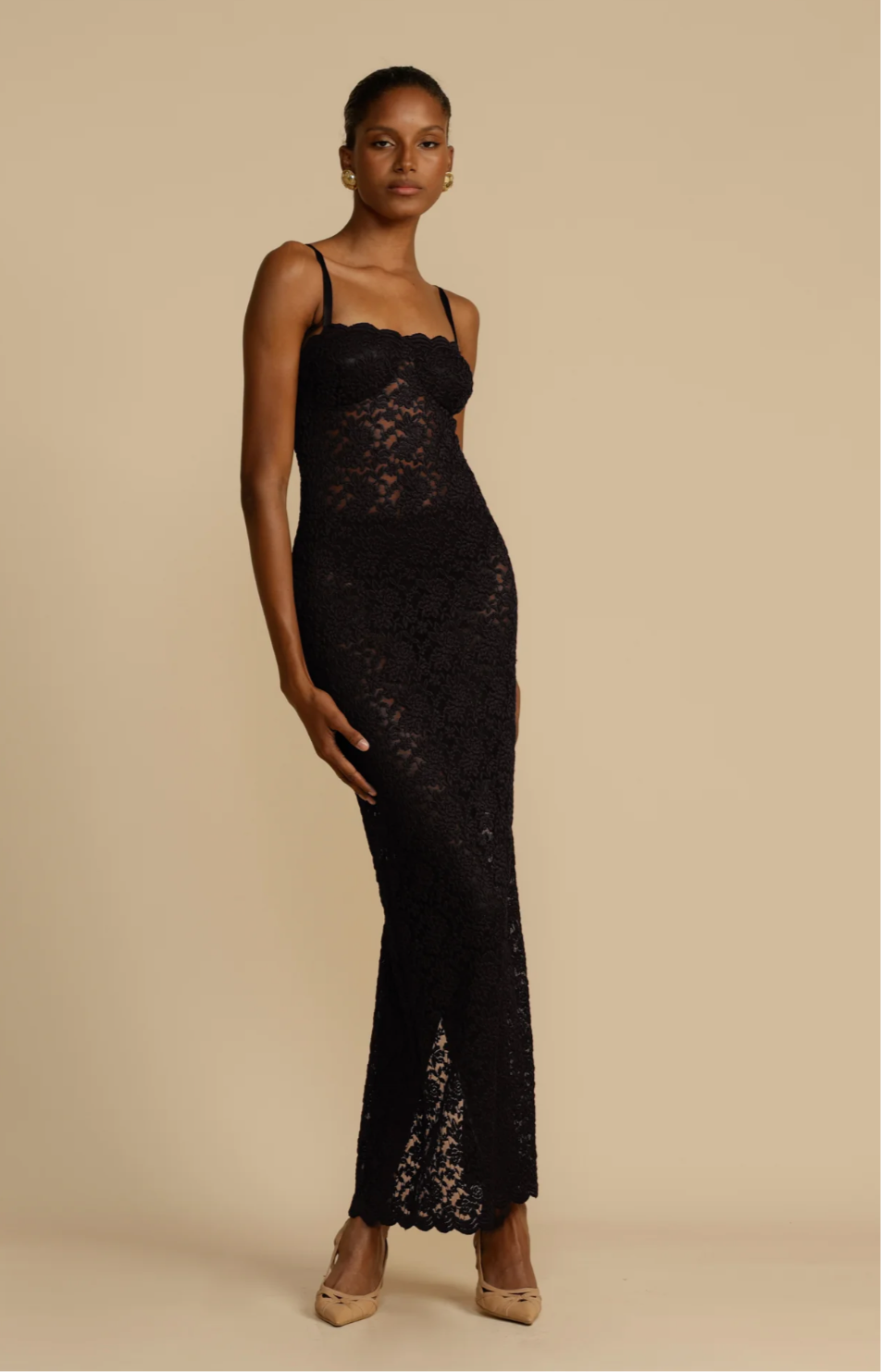 Description: Made from vintage-inspired lace with scalloped edges, the Margot flows into a floor-length maxi featuring a centre-back split for ease of movement. It boasts a semi‑sweetheart neckline, with the bust lined for coverage and support, enhancing both comfort and design. Thin adjustable shoulder straps with gold fastenings let you tailor the fit.