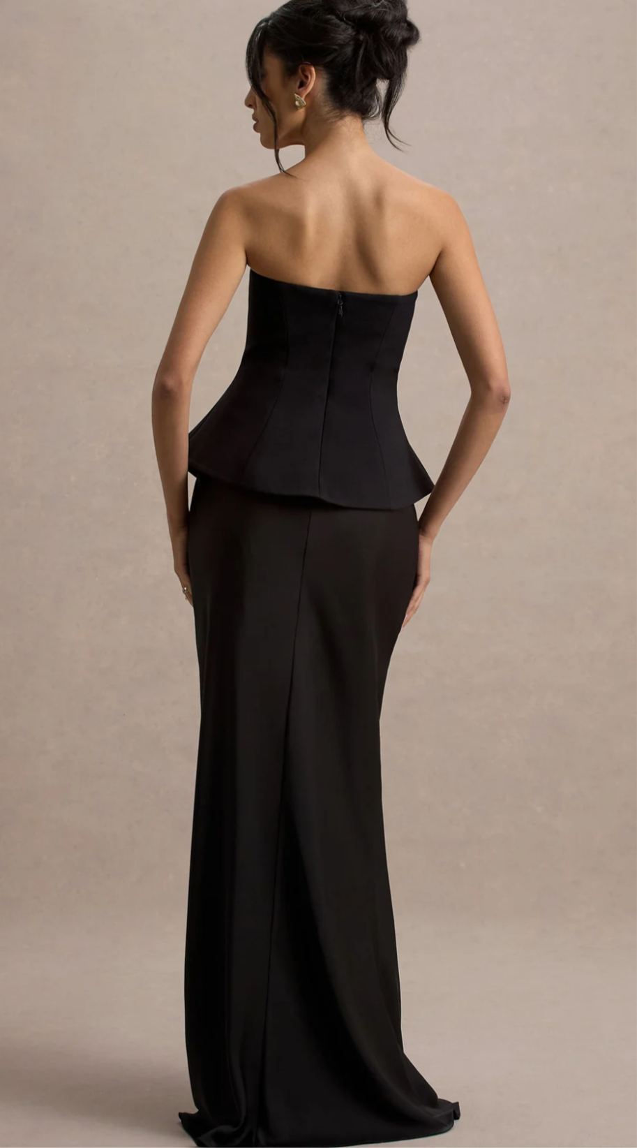 Description: Designed in a combination of premium stretch crepe and satin, in a rich black hue, ensuring you are snatched while the skirt moves with you seamlessly. The sleek bandeau neckline, adds to the overall effortless elegance of this gown.