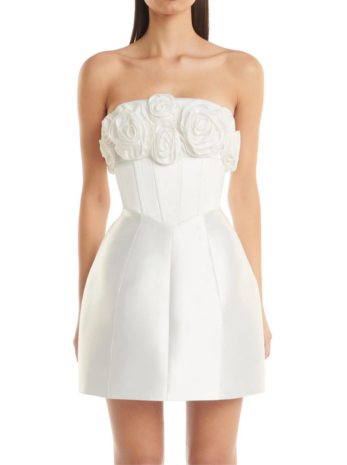 Description: The Tehanni Dress features a strapless neckline and fitted corset bodice which effortlessly cascades into a full mini skirt. The focal point is the bust which is adorned with handcrafted scattered flower embellishments. Fully lined with an invisible zipper at the centre back.