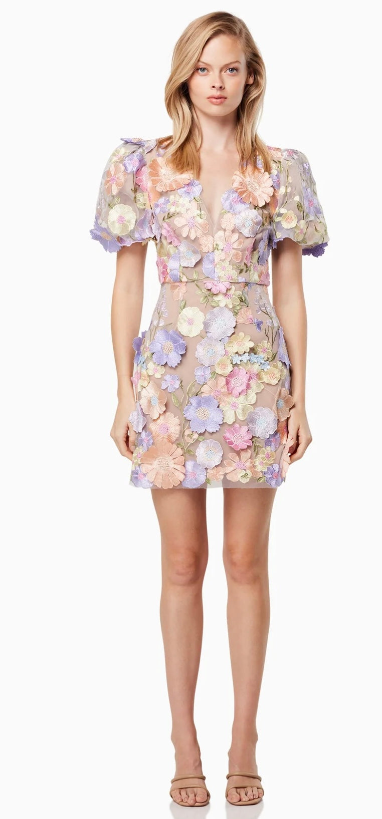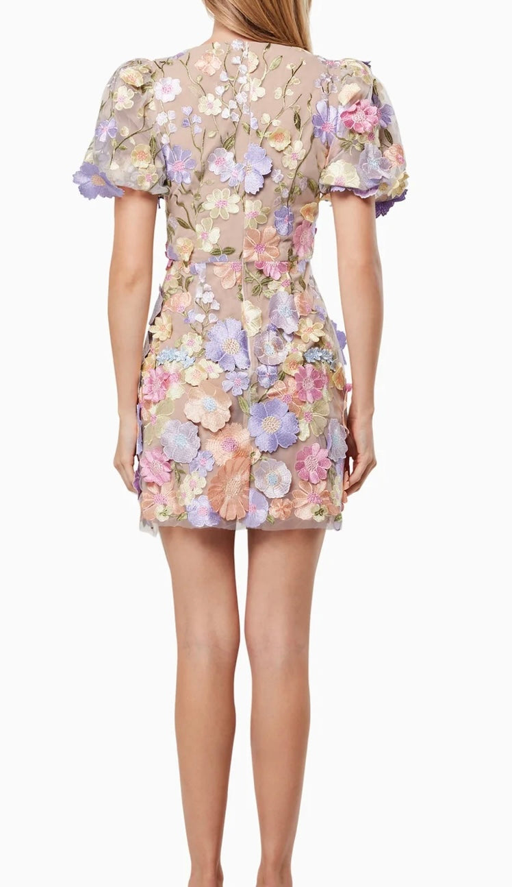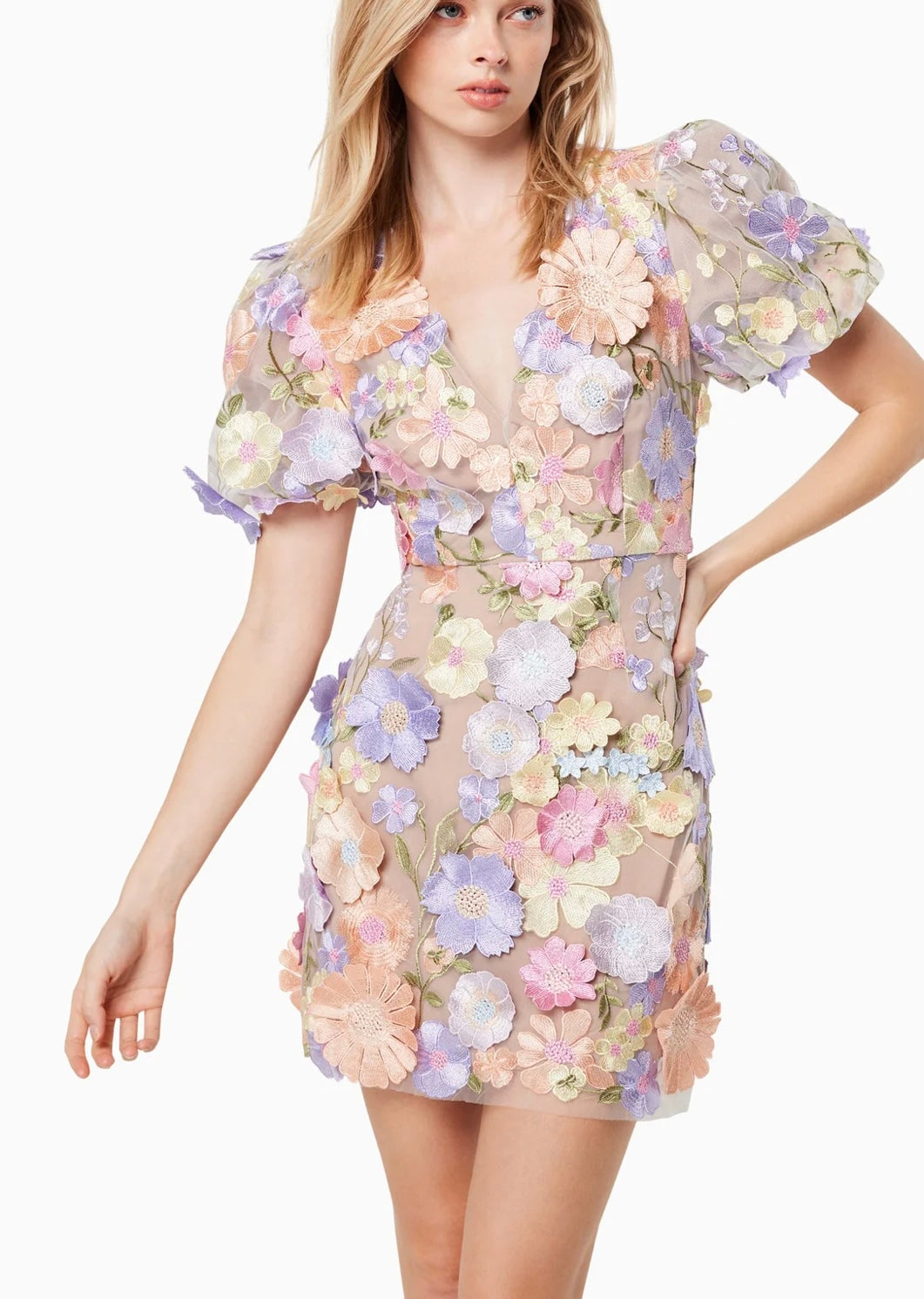 Description: Crafted from intricate 3D lace fabrication, this dress is a true work of art. The short puffed sleeves and v-shaped neckline create a charming silhouette. The mini length adds a flirty and youthful vibe.