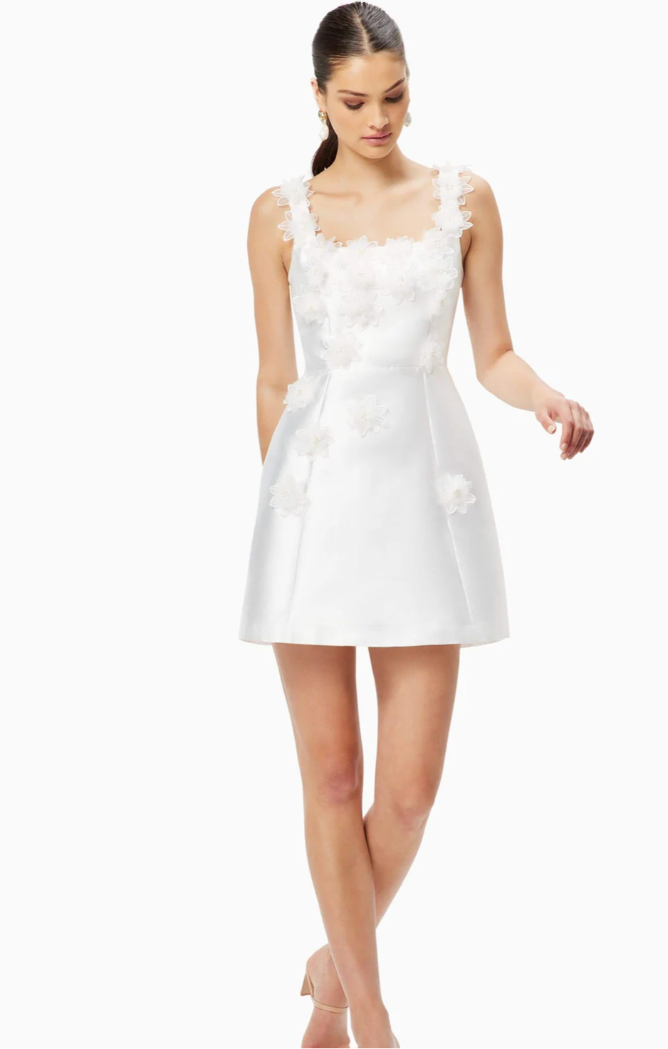 Description: Turn heads in this chic white satin mini, featuring a flattering A-line silhouette and delicate 3D floral appliqués along the neckline and skirt. With its structured fit and feminine details, this dress is ideal for bridal showers, engagement parties, or any elegant celebration. Pair with strappy heels for a timeless, polished look.