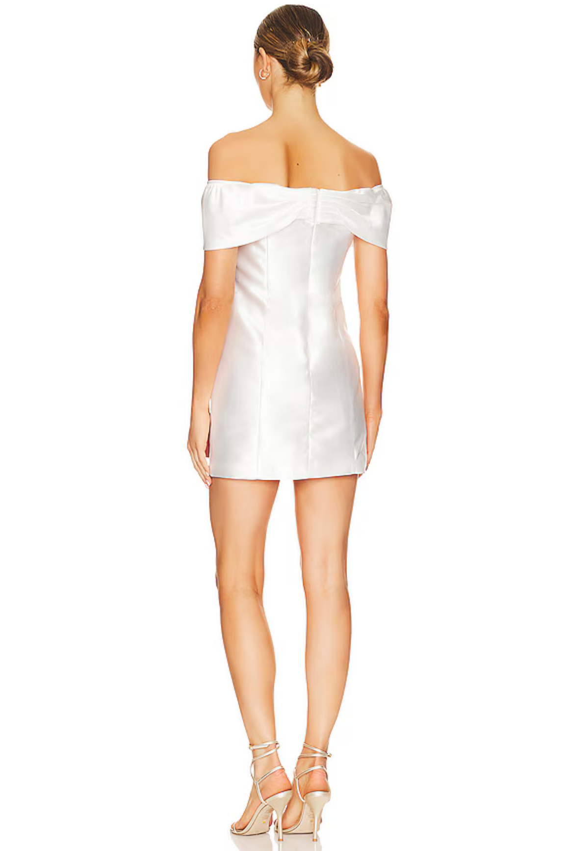 Description: Off-the-shoulder white satin mini dress. Designed with a dramatic fold-over neckline that forms a bow-like detail across the bust, this piece strikes the perfect balance between modern elegance and playful femininity. The structured bodice and sleek mini silhouette flatter the figure, while the lustrous satin fabric adds a touch of glamour.