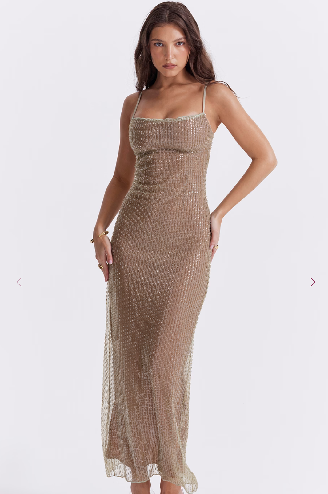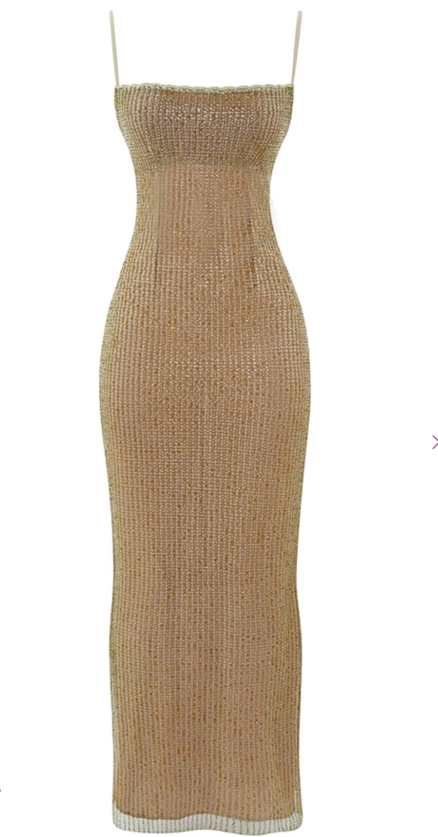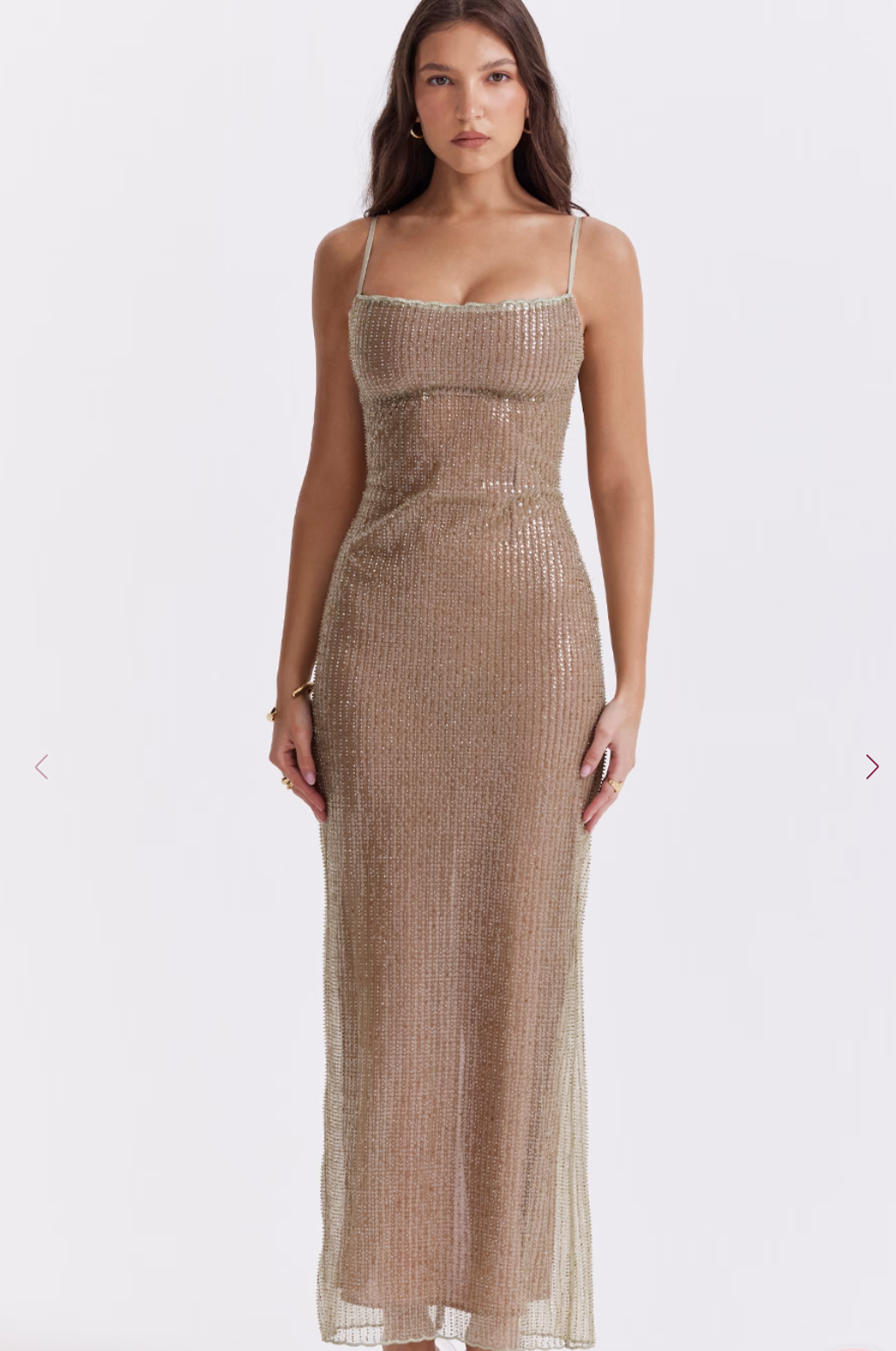 Description: Delicately made from a shimmering hand beaded fabric and backed in a curve creating cafe au lait powermesh lining for a gorgeous contrast. The barely there satin straps adjust for the perfect fit and the split to the back makes for easy movement.