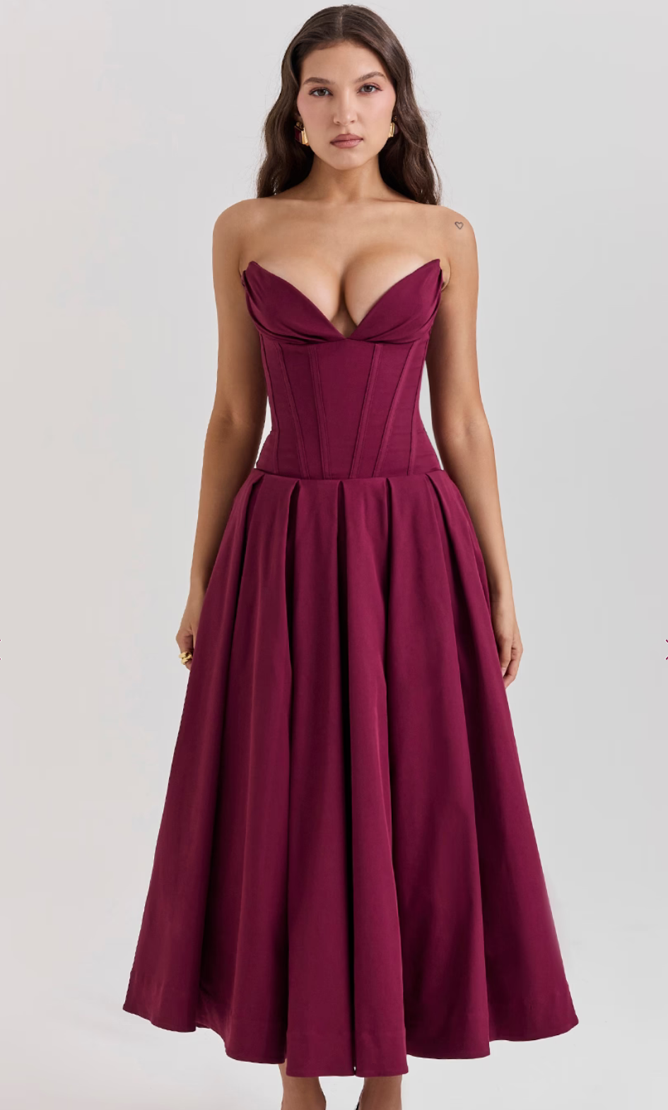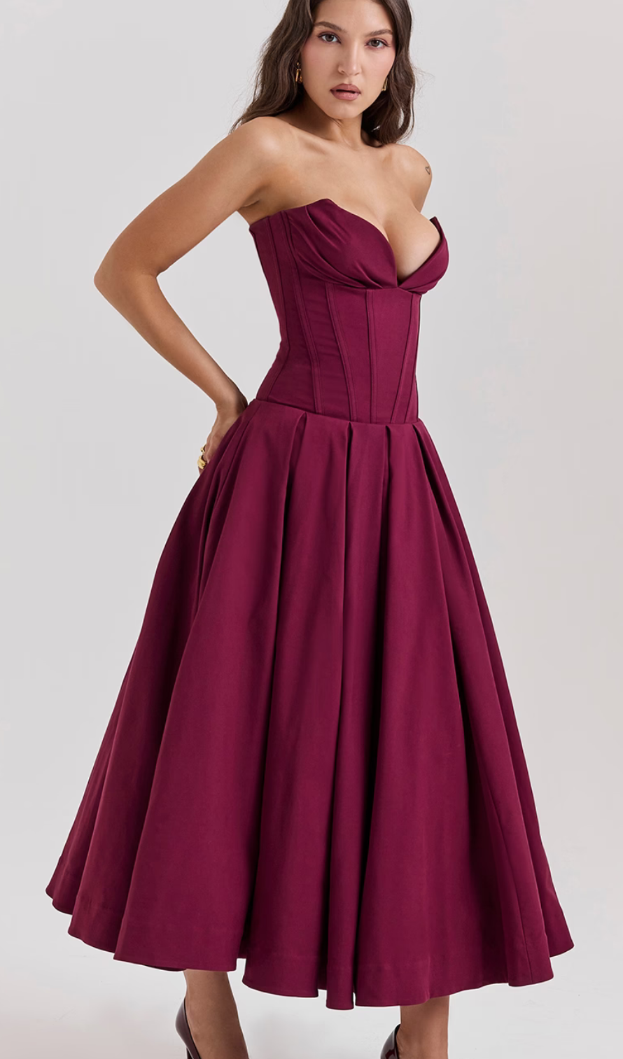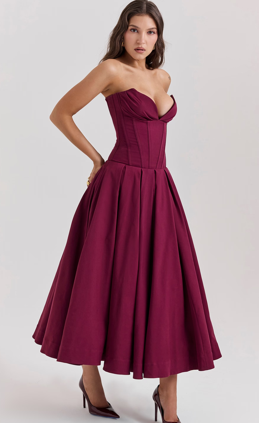 Description: The architectural sculpted bodice is perfectly boned to cinch your waist and contrasted by the full, feminine, voluminous skirt. There’s layers and layers of tulle under the skirt to maintain that perfect shape and it zips to the back for easy on.