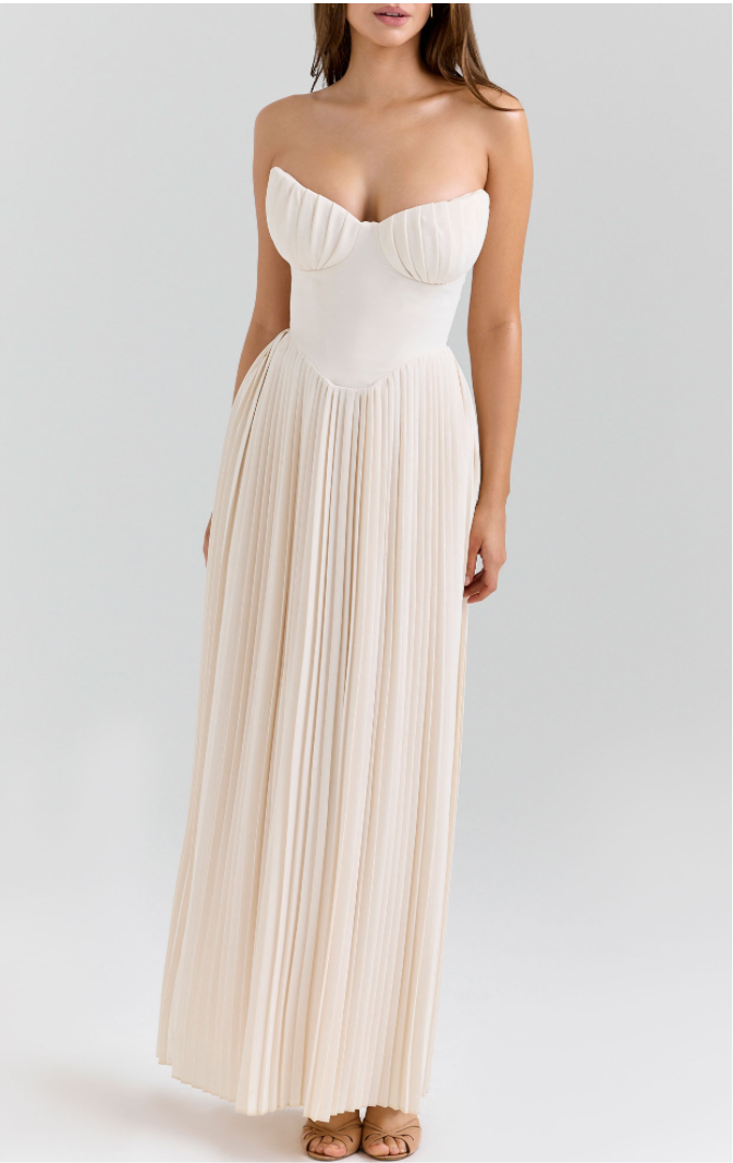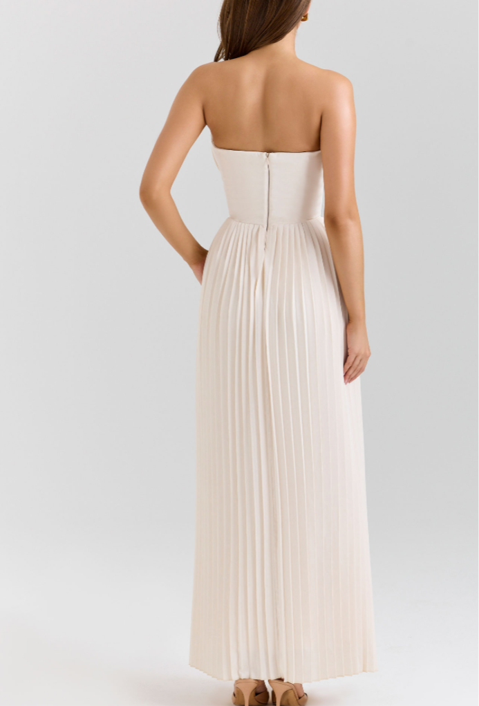 Description: The dress is characterized by its strapless, sweetheart neckline, boned bodice, and pleated georgette fabric that creates a flowing, elegant silhouette.