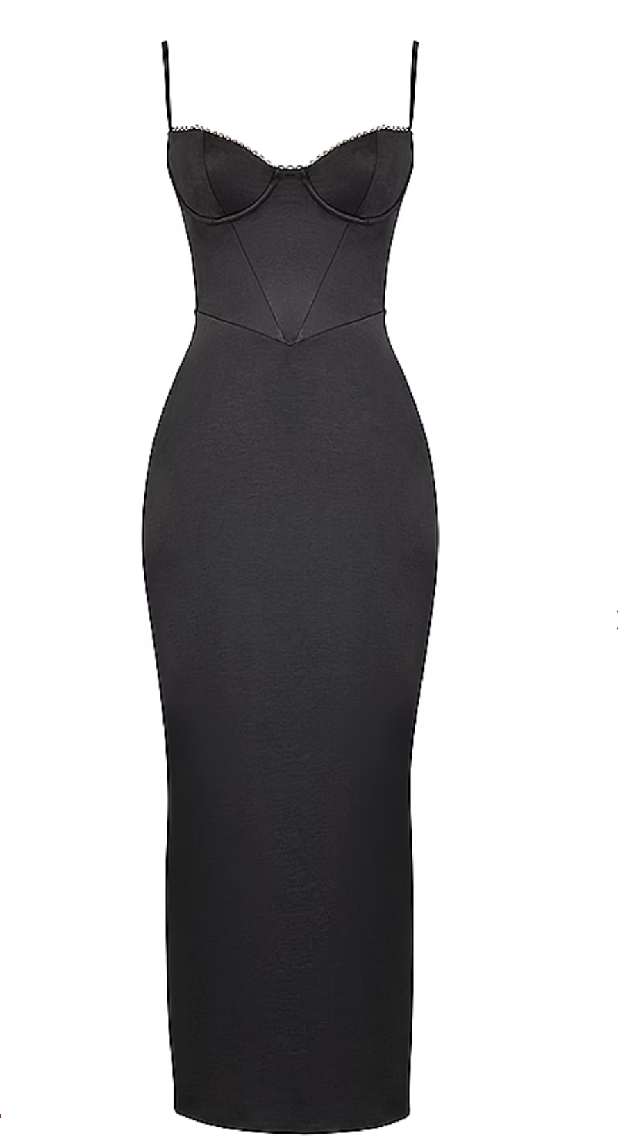 Description: Cut from lustrous sheen black satin and cut on the bias to gently skim your figure. The structured bodice features corsetry boning to cinch the figure in and the pretty lace trimmed cups are softly lined and underwired for full support and uplift, framed by delicate shoulder straps to adjust for the perfect fit. The skirt falls to an elegant floor grazing length and is fully lined for smooth comfort.