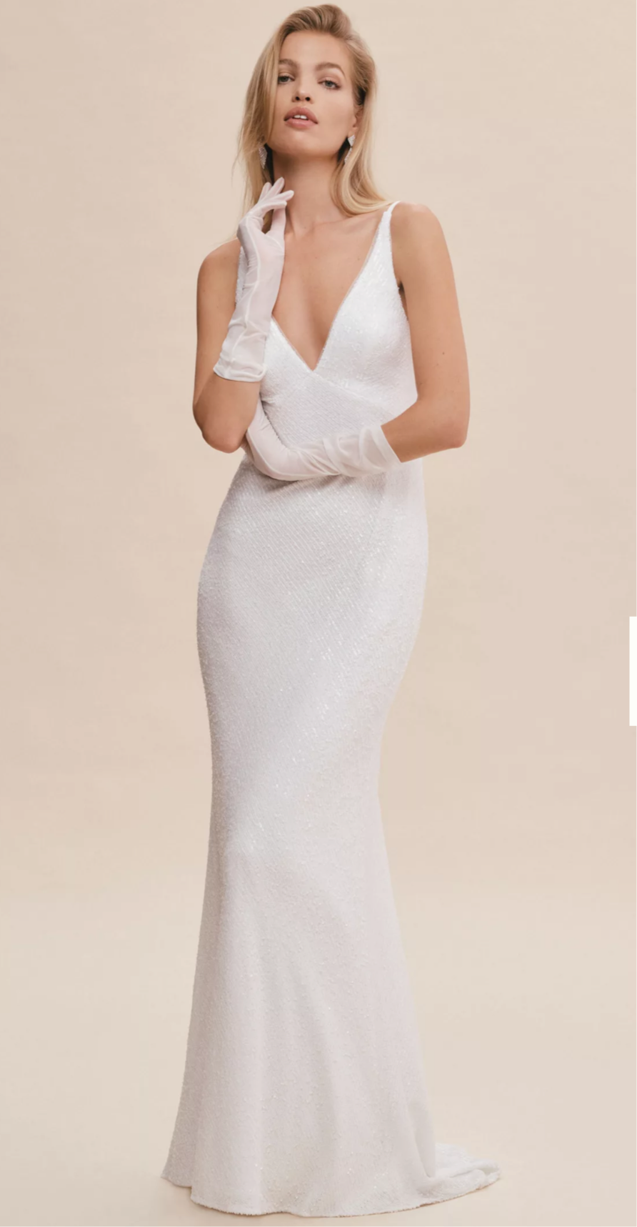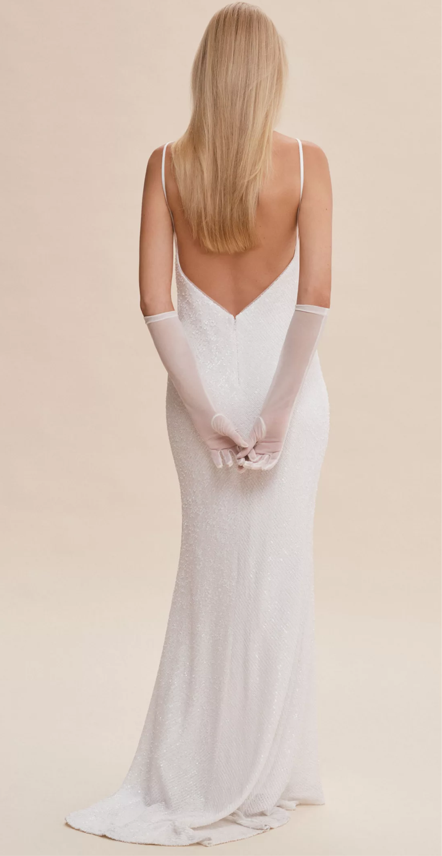 Description: A fit-and-flare cut that gently skims through the bodice and hips, then flares out toward the hem, creating an elegant, elongating line. The simple spaghetti strap v-neckline is given a modern twist with a captivating open back that cascades to a subtle train. The gown is covered in all-over sequins, giving it shimmer and high-glamour appeal.