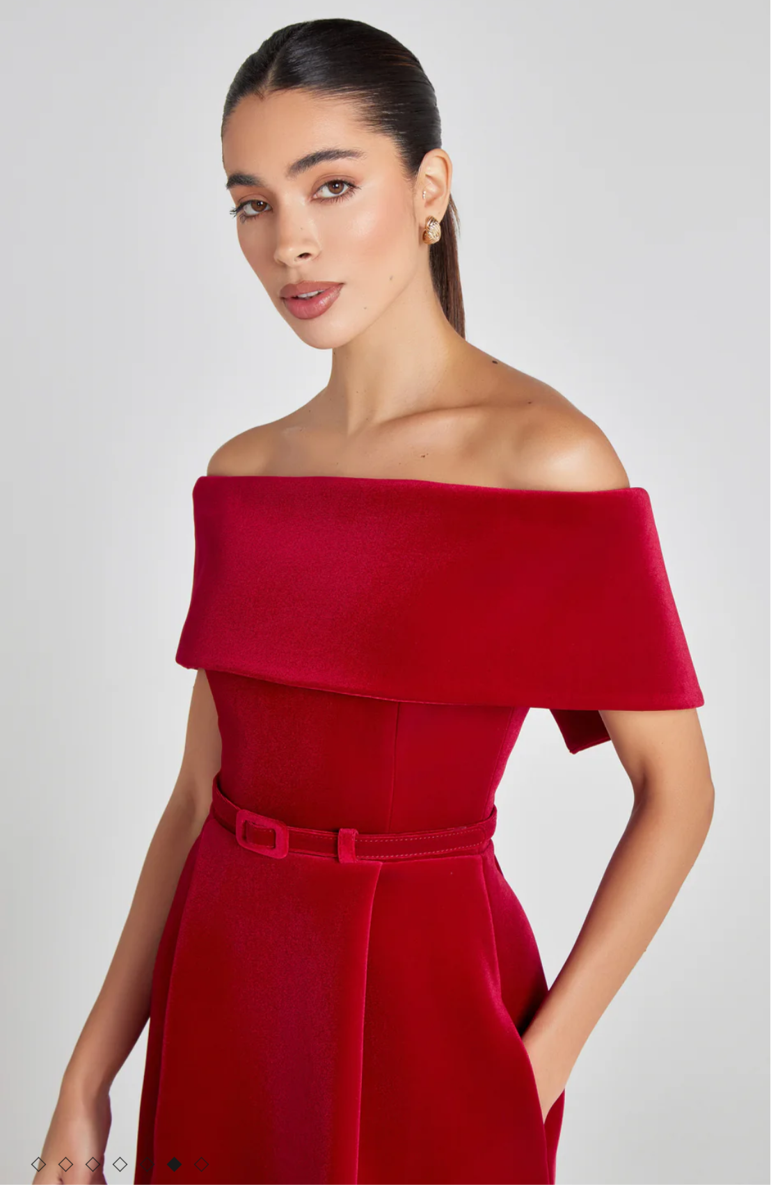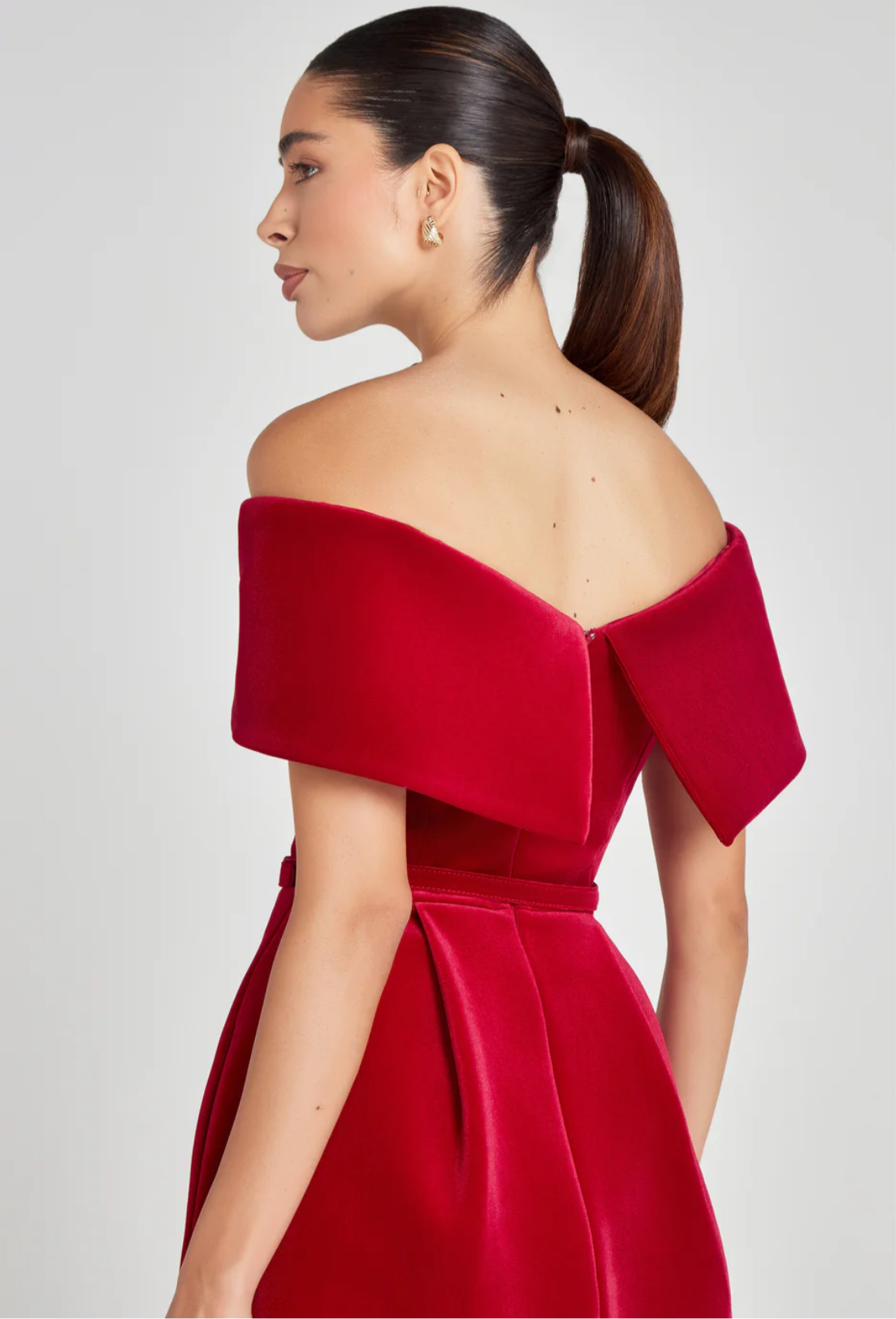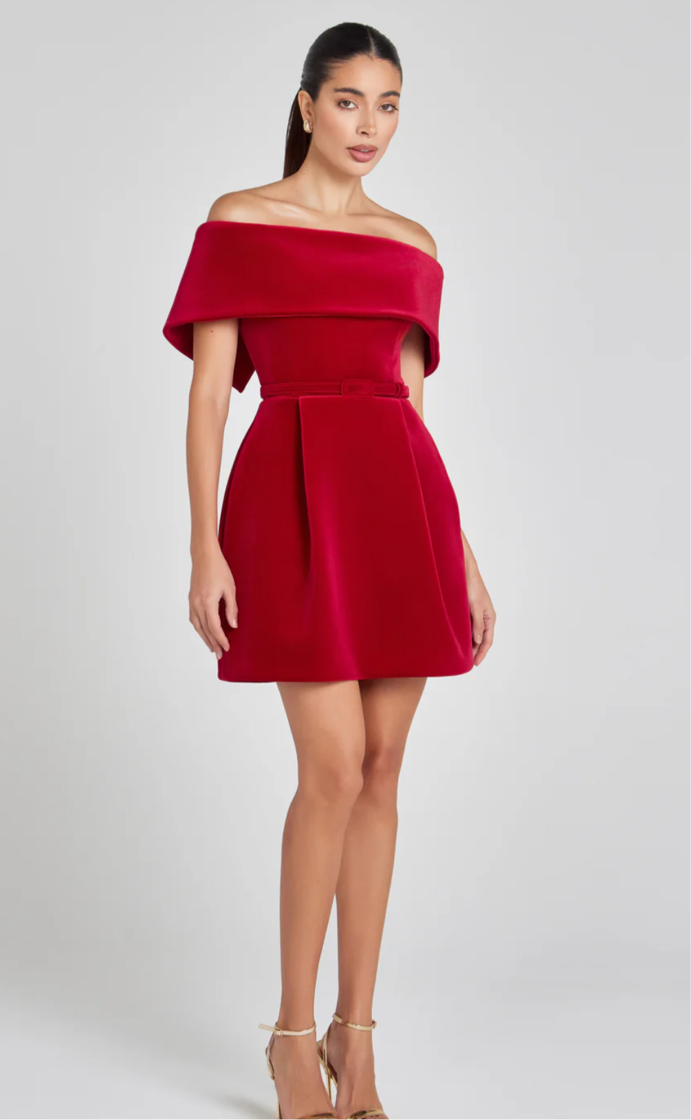 Description: An off-the-shoulder mini dress, crafted from exclusively designed red velvet with a structured pleat-detailed skirt with pockets, a detachable red velvet belt, and a concealed zip closure to the back.