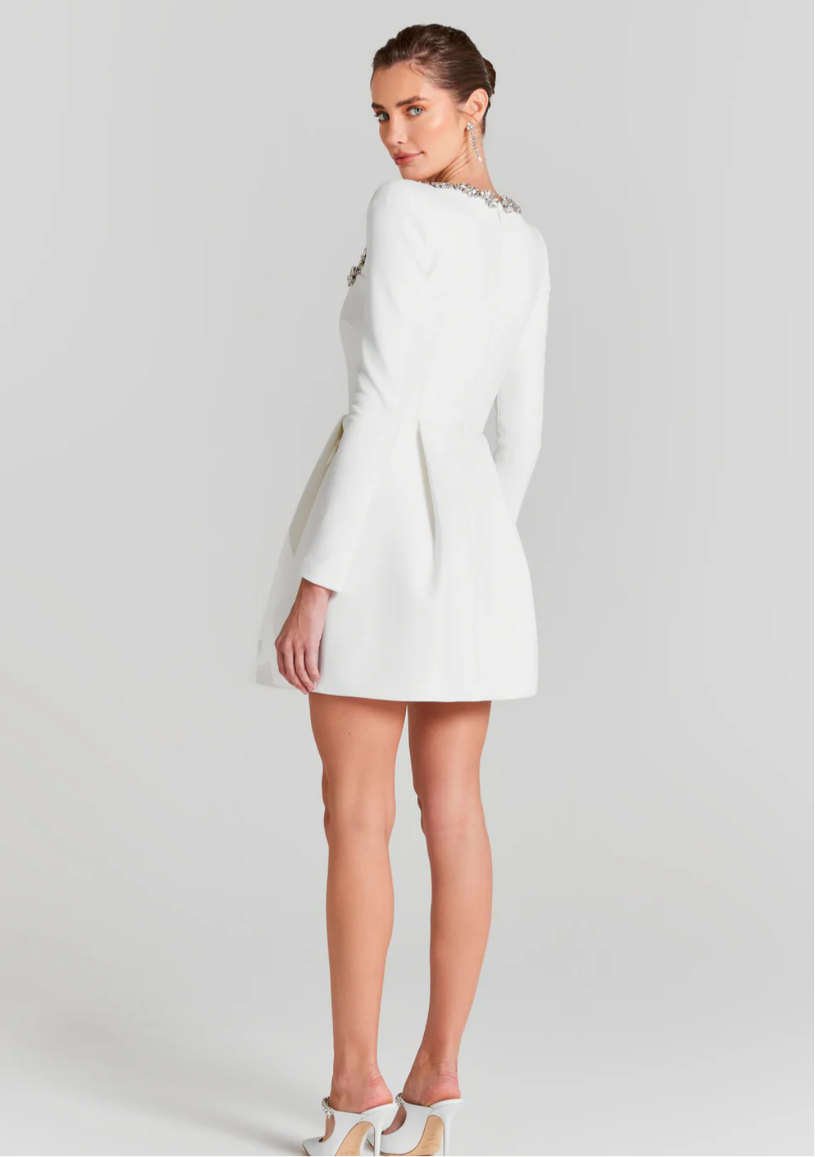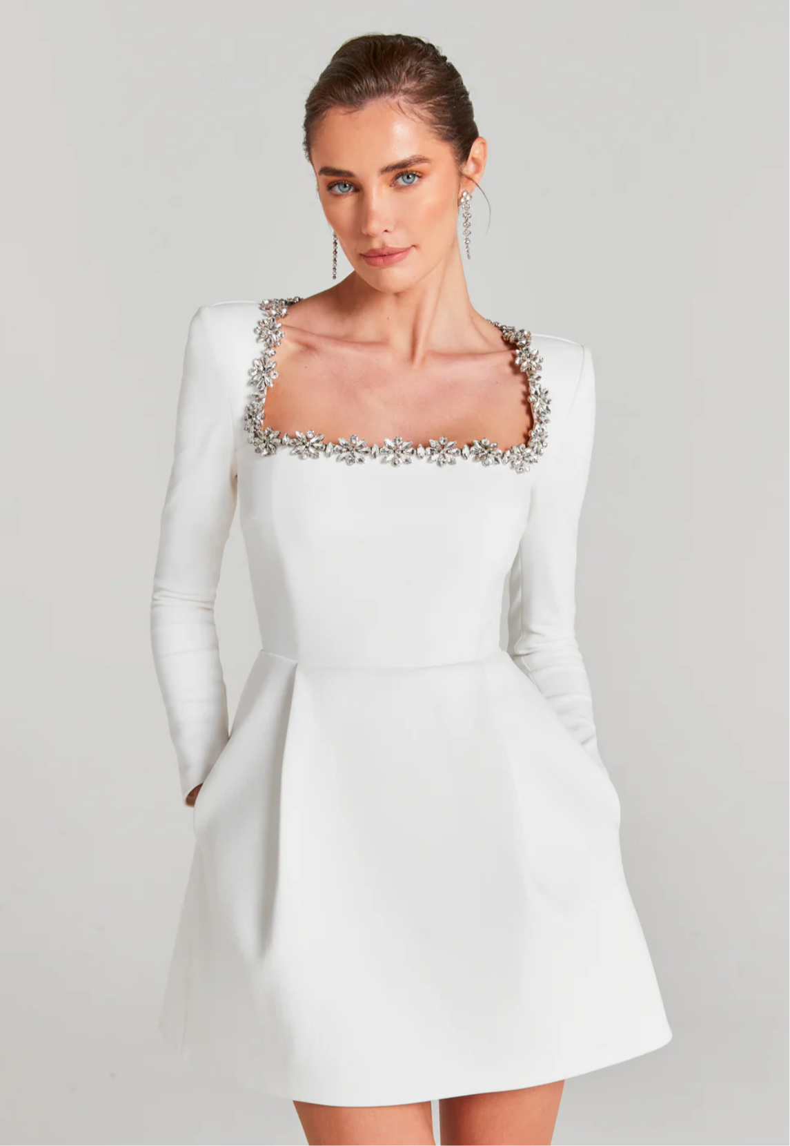 Description: Kimberley is a white mini dress, crafted from exclusively designed white crepe fabric with a jewel-embellished square neckline, shoulder pads, structured bodice, and two pleats adorning both the front and back of the skirt.