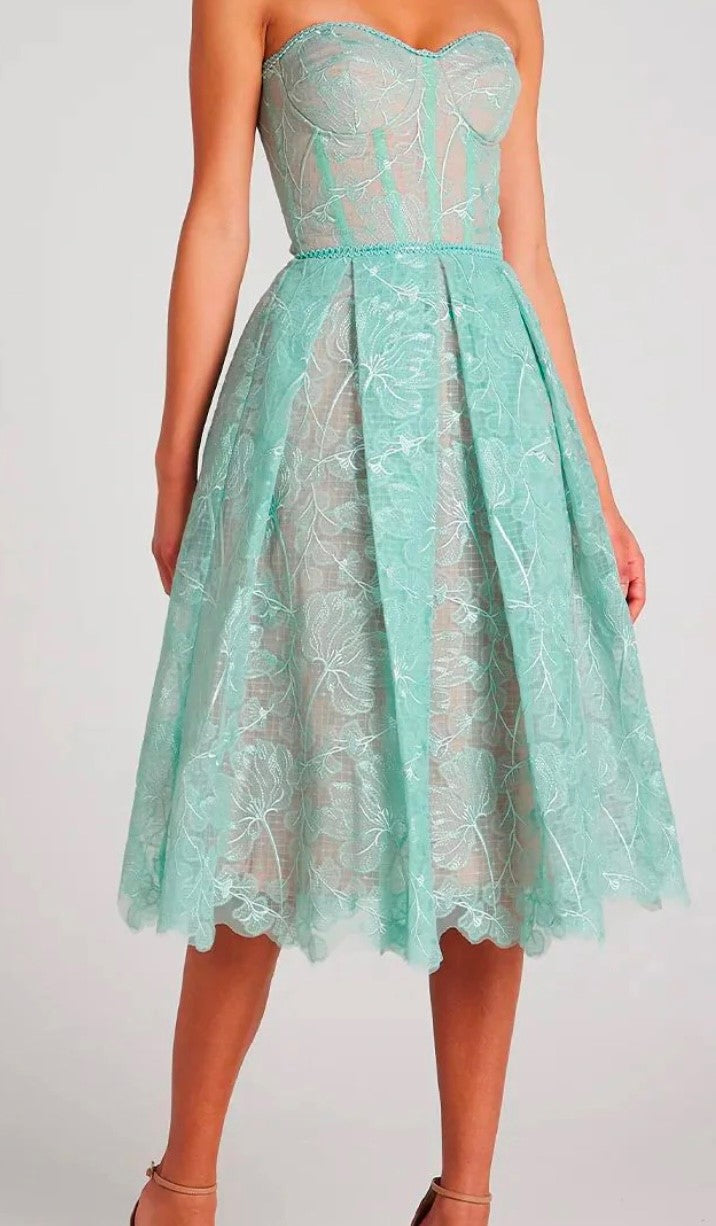Description: Crafted from a luxurious floral lace fabrication, complete with a bandeau sweetheart neckline, a corseted bodice, and a layered mesh midi skirt.