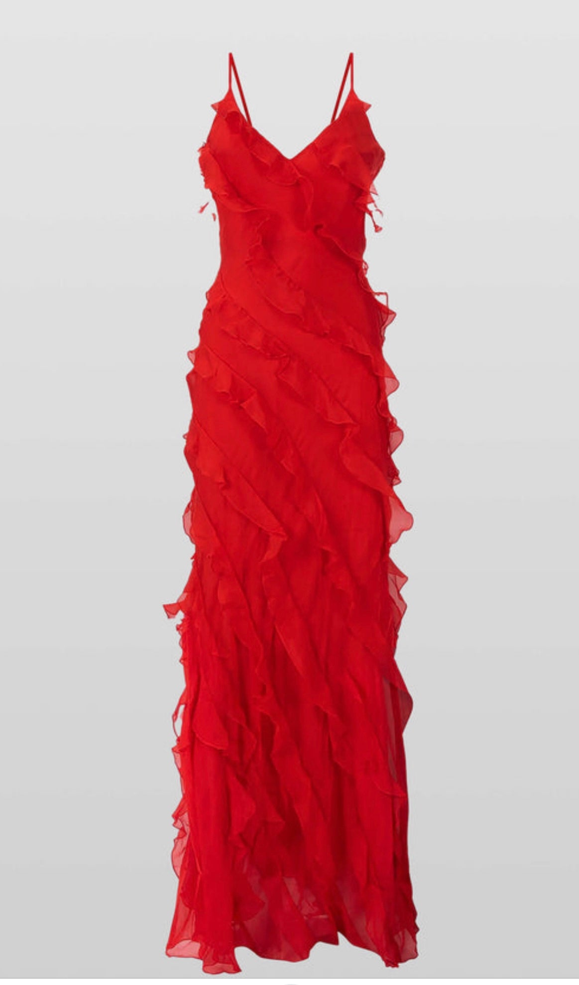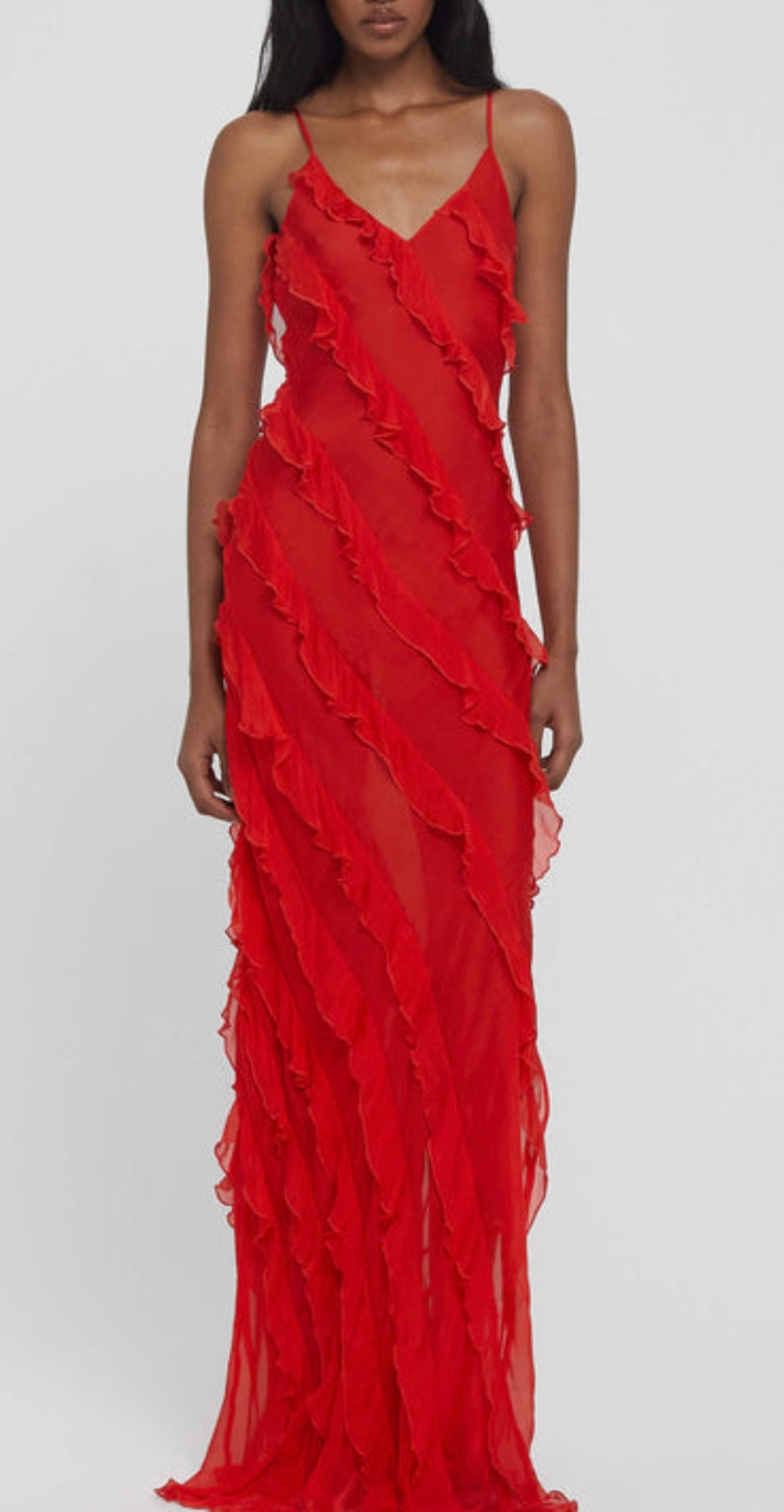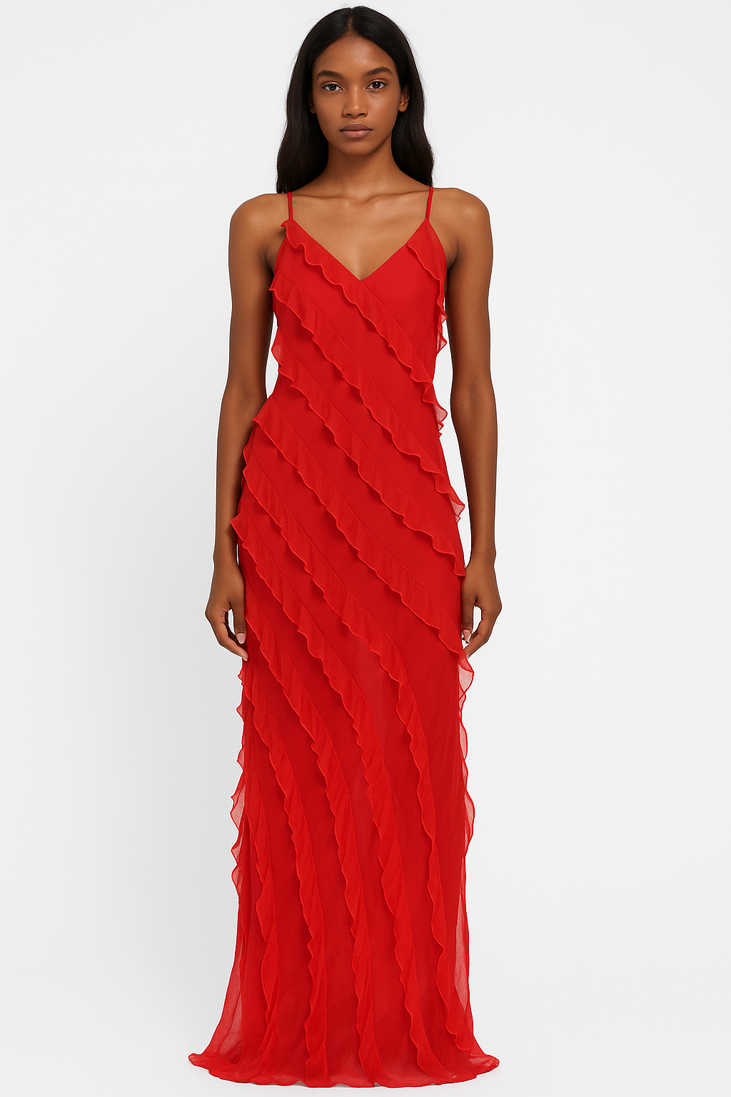 Description: Flirting with femininity, dancing with passion and oozing sex appeal; this floor length dress with cascading frills is designed to hug and accentuate your curves. The ultimate show stopper.