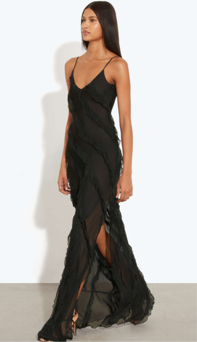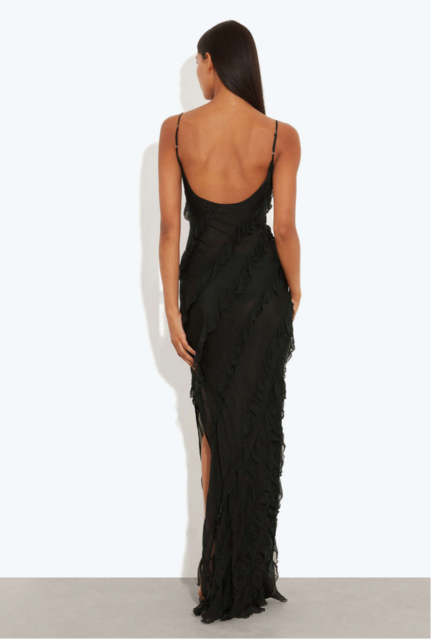 Description: Flirting with femininity, dancing with passion and oozing sex appeal; this floor length dress with cascading frills is designed to hug and accentuate your curves. The ultimate show stopper.