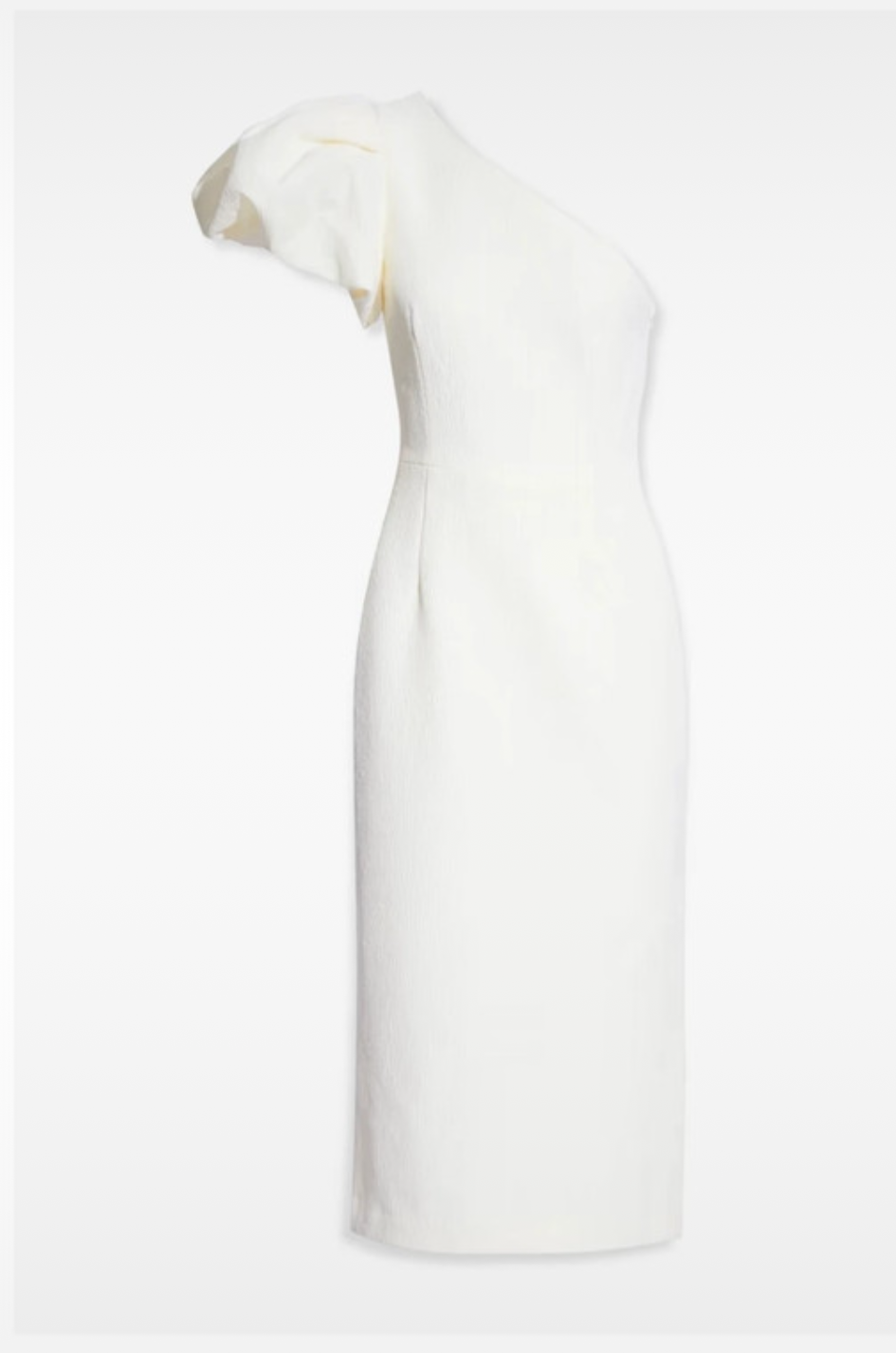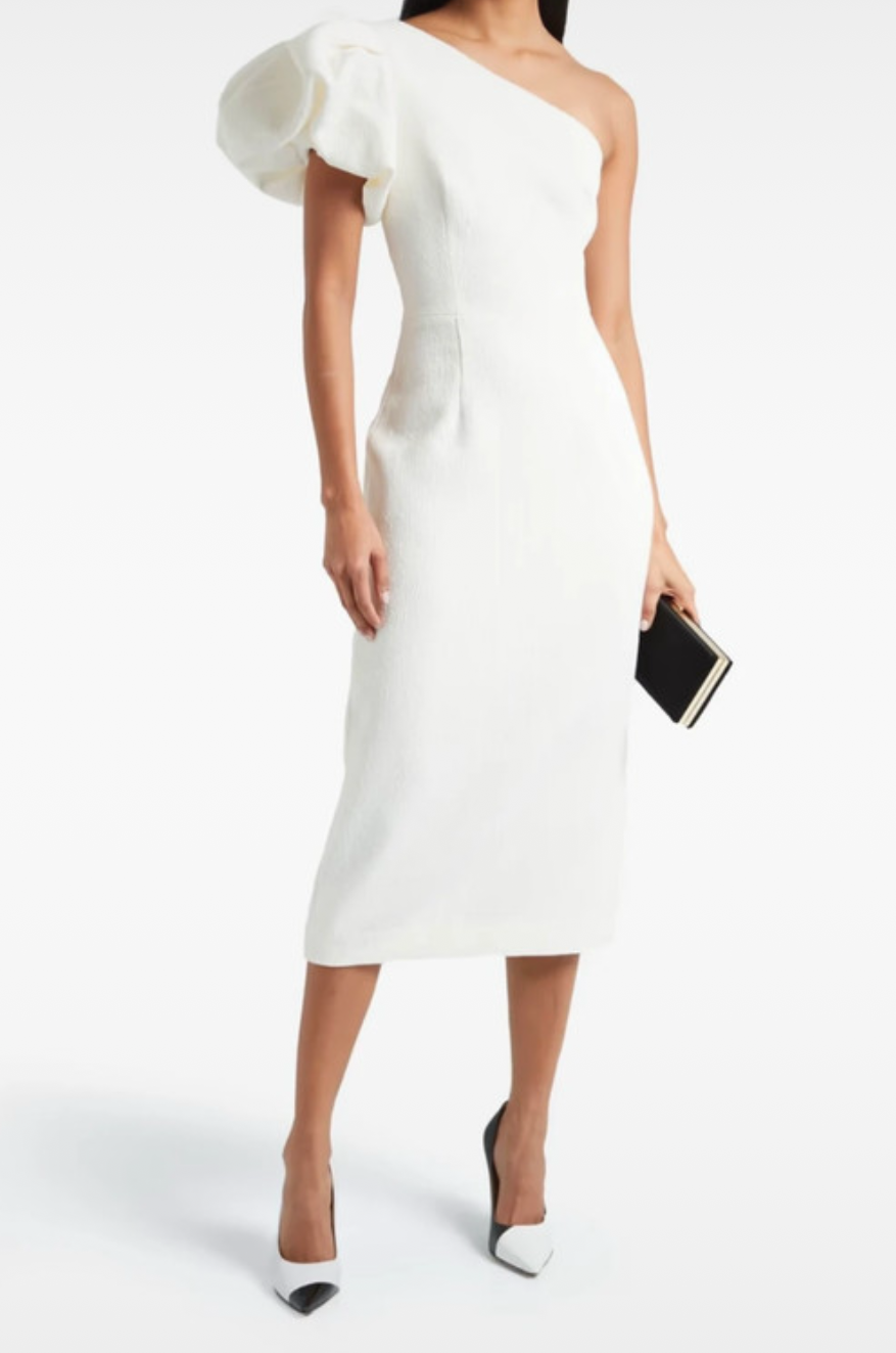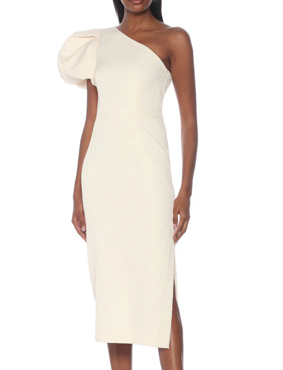 Description: This ivory midi features a striking one-shoulder neckline with a dramatic ruffled puff sleeve. Crafted from premium structured crepe, it hugs the body beautifully and falls to a flattering midi length with a subtle back vent for easy movement
