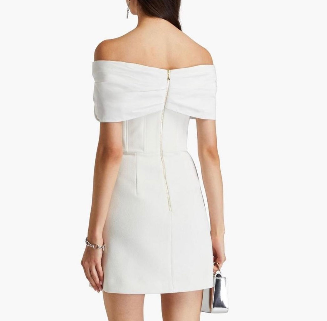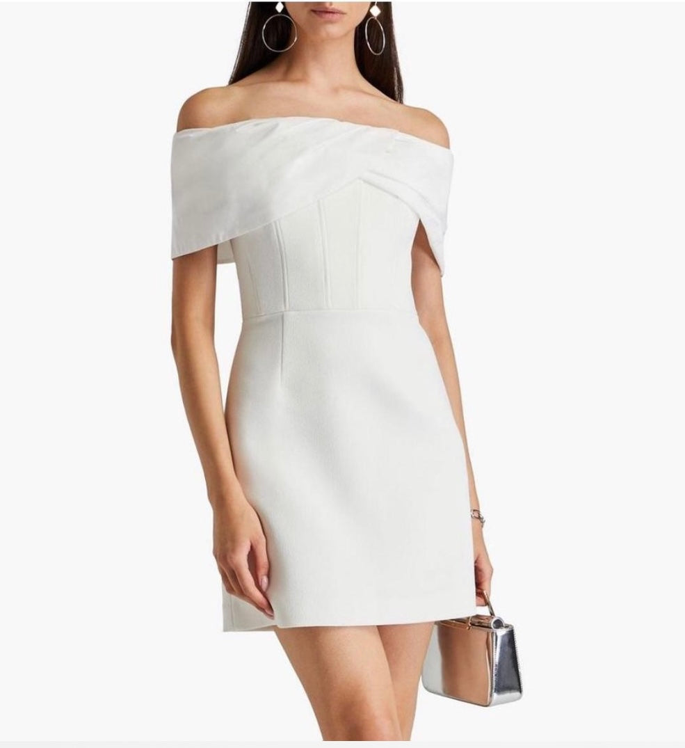 Description: Elegant off-the-shoulder crepe and taffeta white mini dress with a structured bodice and draped neckline detail. A chic, modern silhouette perfect for parties, engagements, or special occasions.