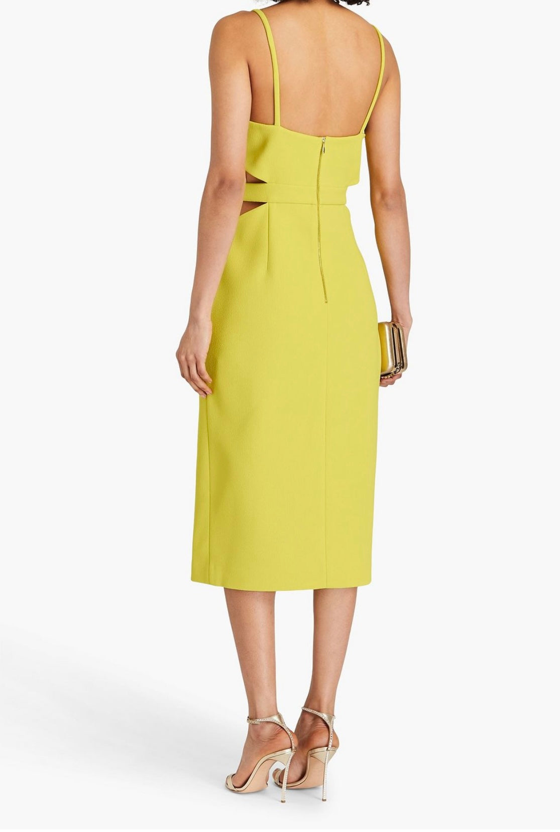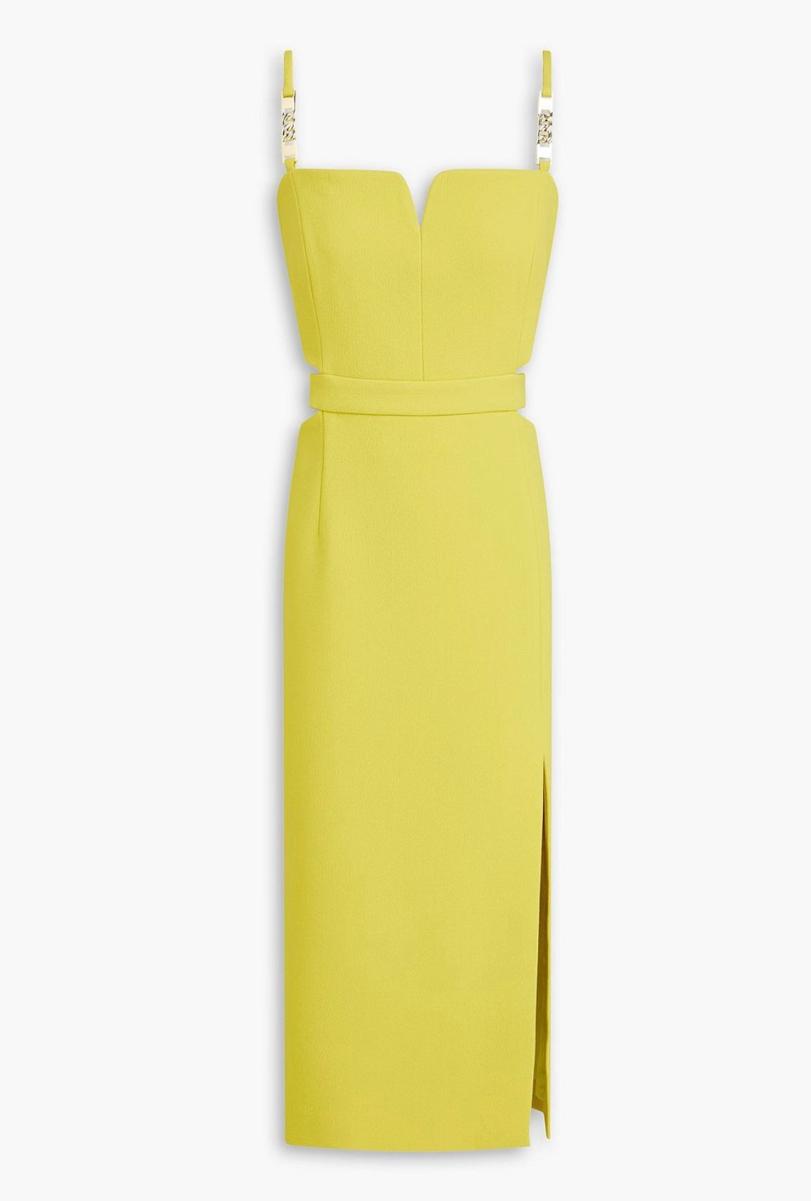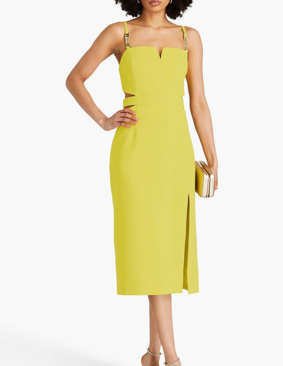 Description: This vibrant yellow midi dress features a structured, form-fitting silhouette with elegant details. The bodice showcases a sweetheart neckline with a subtle notch and flattering cut-out sides that accentuate the waist. Gold-tone chain straps add a touch of glamour, while a front slit enhances ease of movement and modern flair.