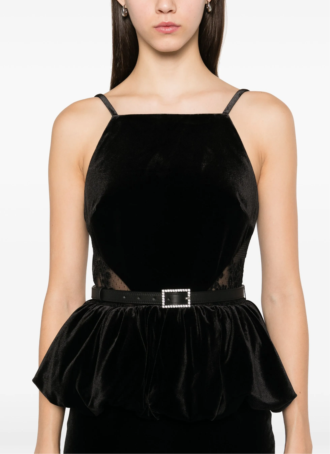 Description: Designed with slim spaghetti straps, a flattering square neckline, and sheer lace side panels. The belted waist cinches the figure, while the structured peplum detail adds drama and shape before falling into a sleek, fitted midi-length skirt.