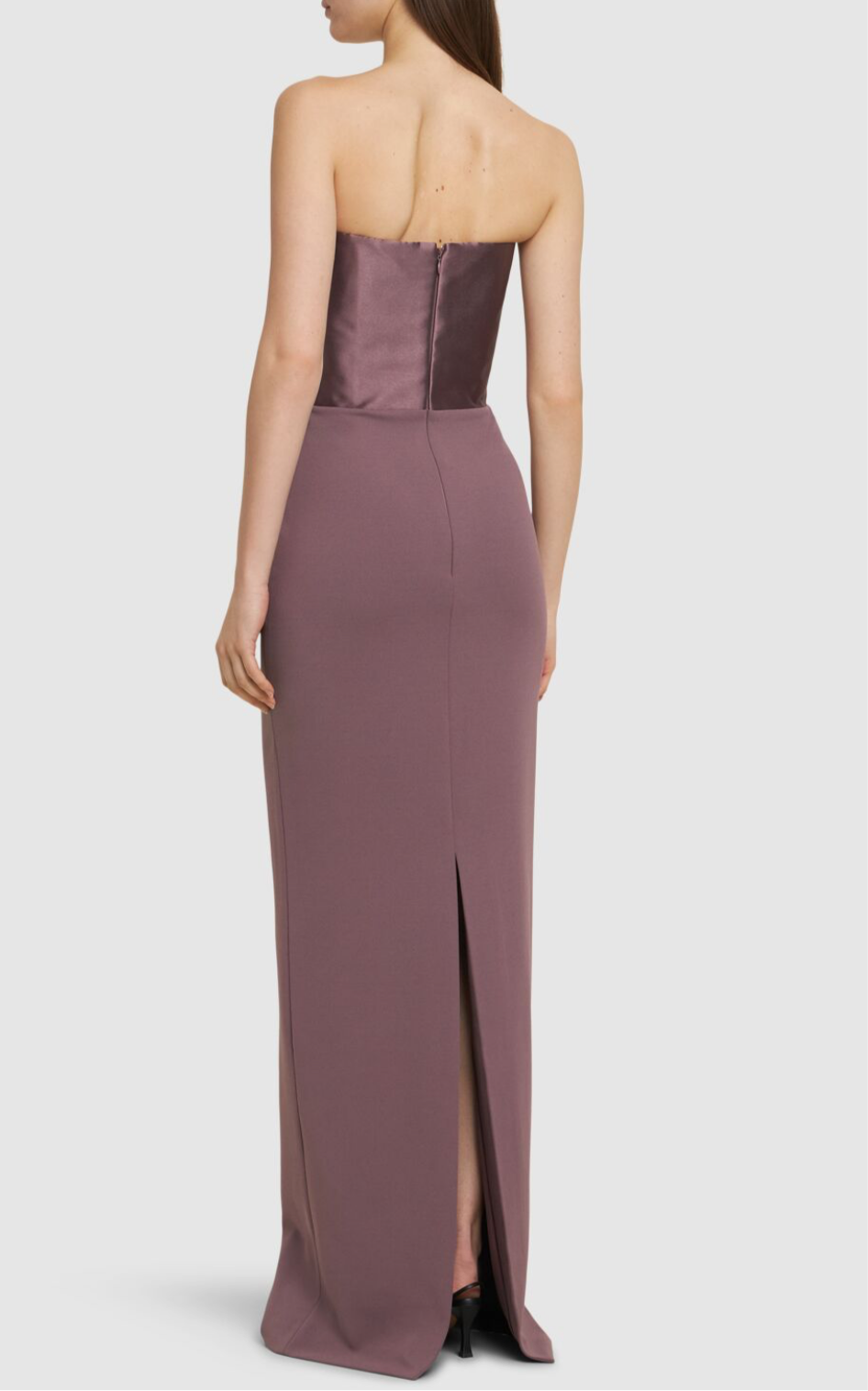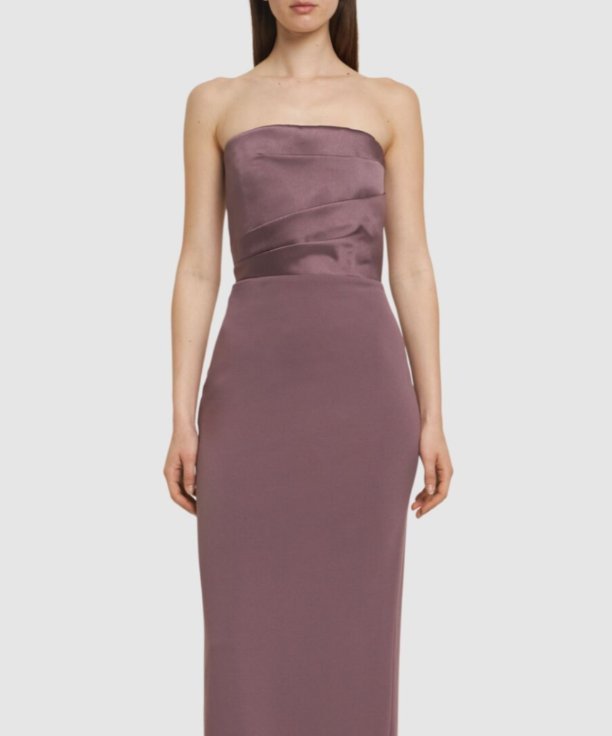 Description: Strapless floor-length gown. Designed in a rich mauve hue, the dress features a structured satin bodice with subtle draping that enhances the silhouette. The sleek, fitted design elongates the figure, while the straight skirt creates a refined and modern finish.