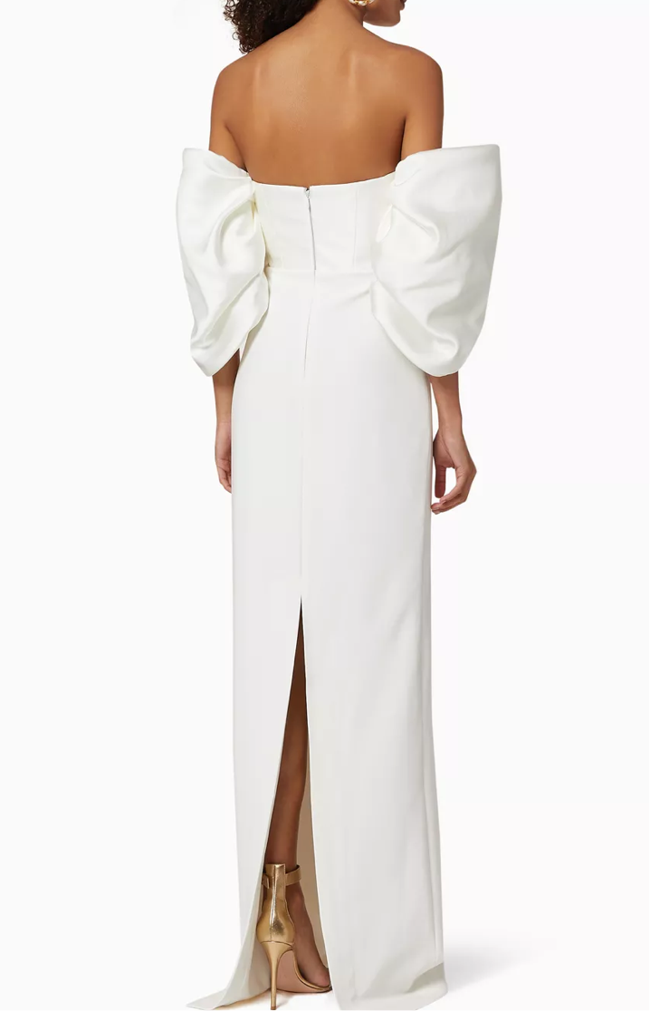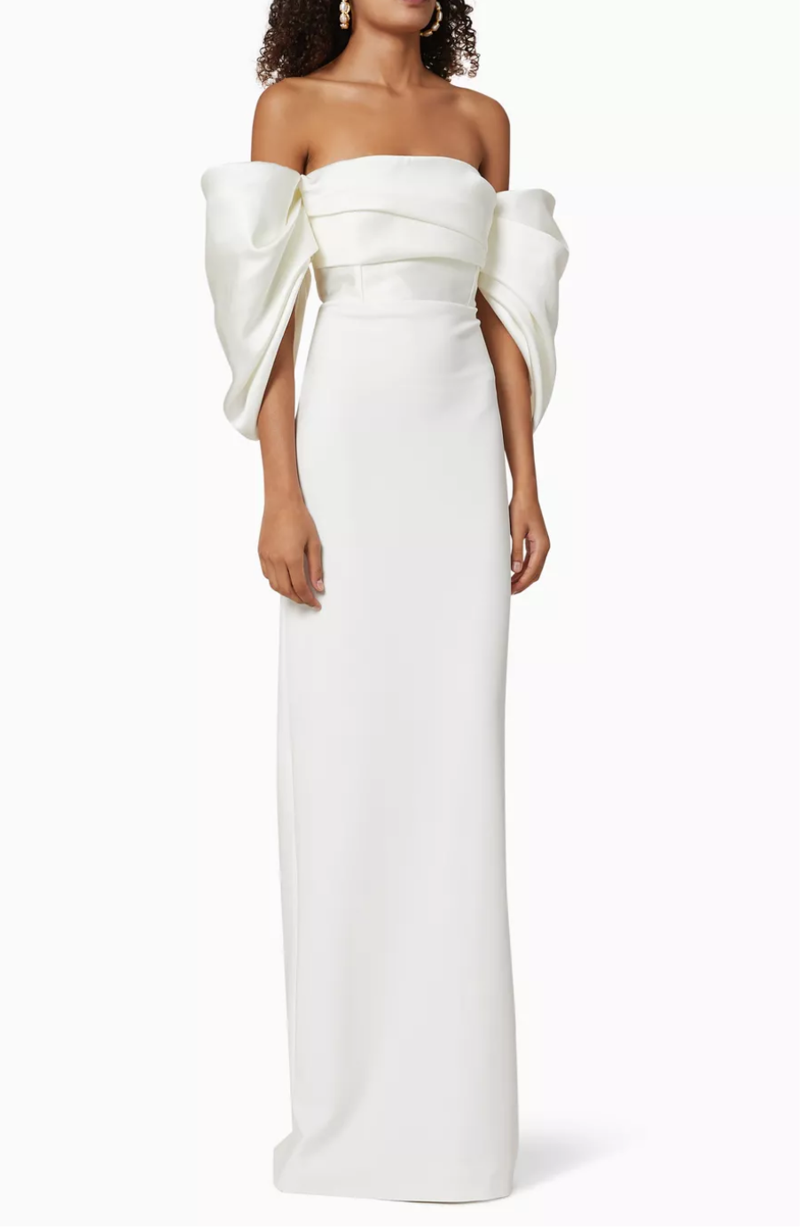Description: Crafted in a crisp ivory hue, this gown features a sculptural off-the-shoulder neckline framed by dramatic oversized draped sleeves that create an artful silhouette. The sleek, floor-length column skirt contrasts the voluminous bodice, balancing bold design with minimalist sophistication. Perfect for contemporary brides.