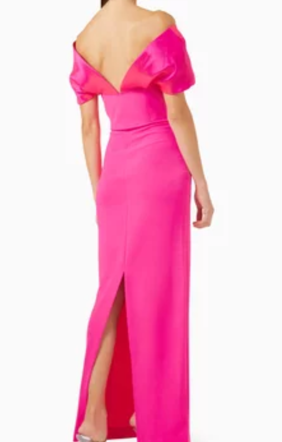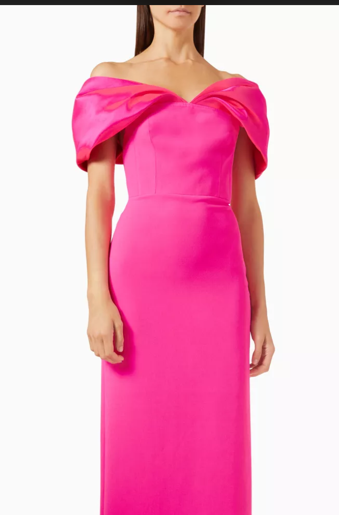 Description: Solace London's Dakota dress is a refined statement piece. The draped off-the-shoulder sleeves exude a sense of timeless glamour, while the slim-fitting column silhouette creates a sleek and modern look.