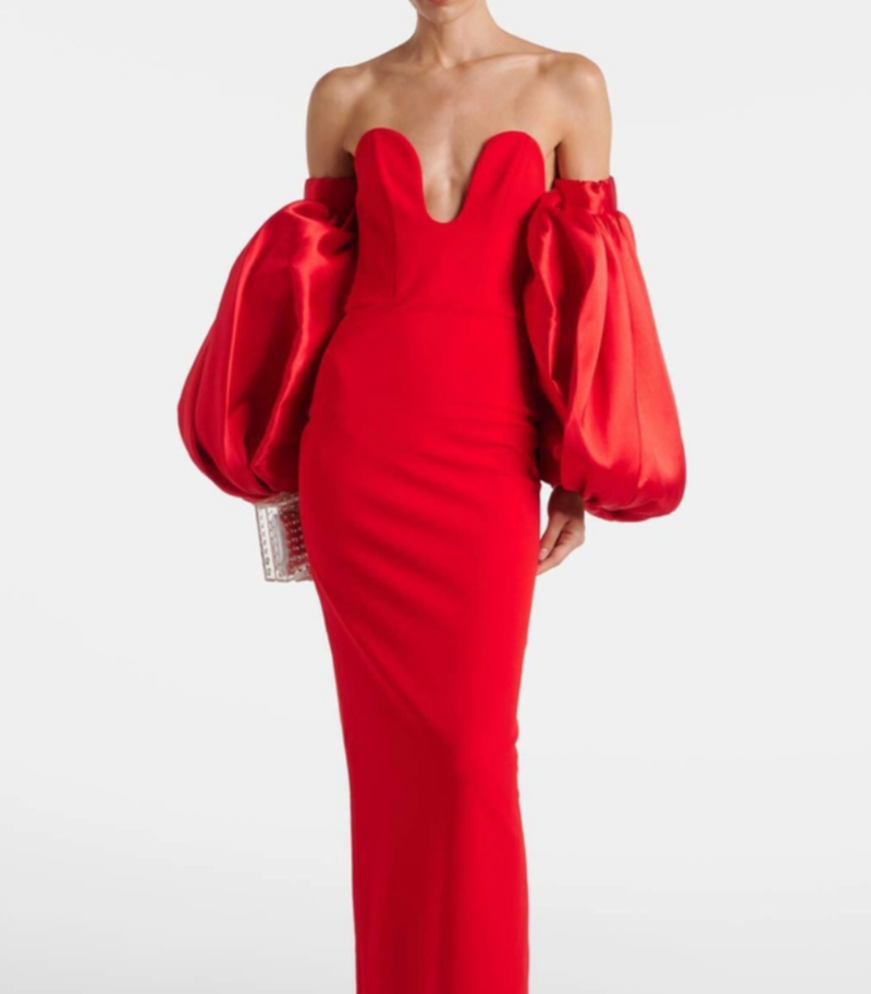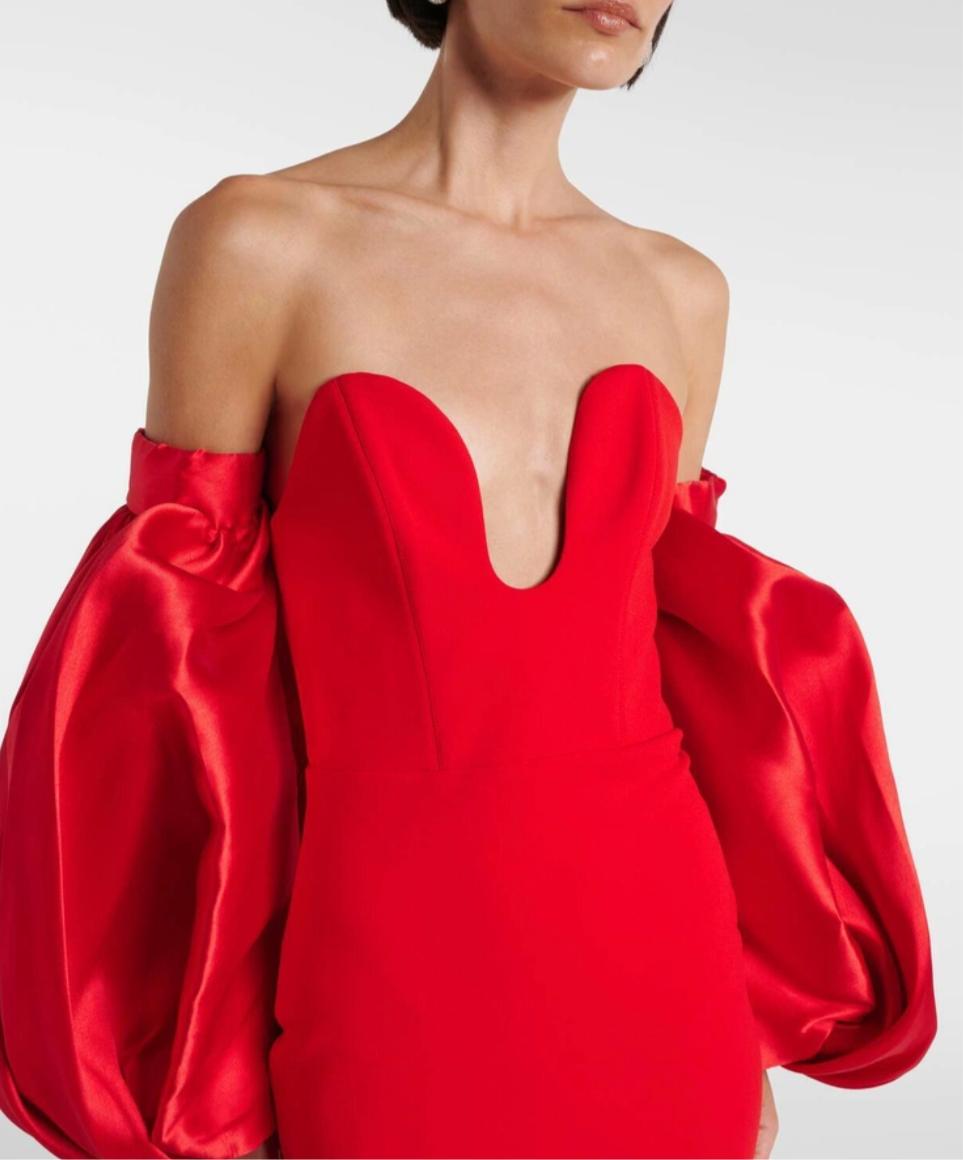 Description: A bold statement piece crafted in vivid red twill and crepe. It features a sculptural strapless neckline with a sweetheart-inspired cut. The gown is distinguished by its dramatic voluminous puff sleeves in glossy fabric, which create striking contrast against the slim, floor-length column skirt.
