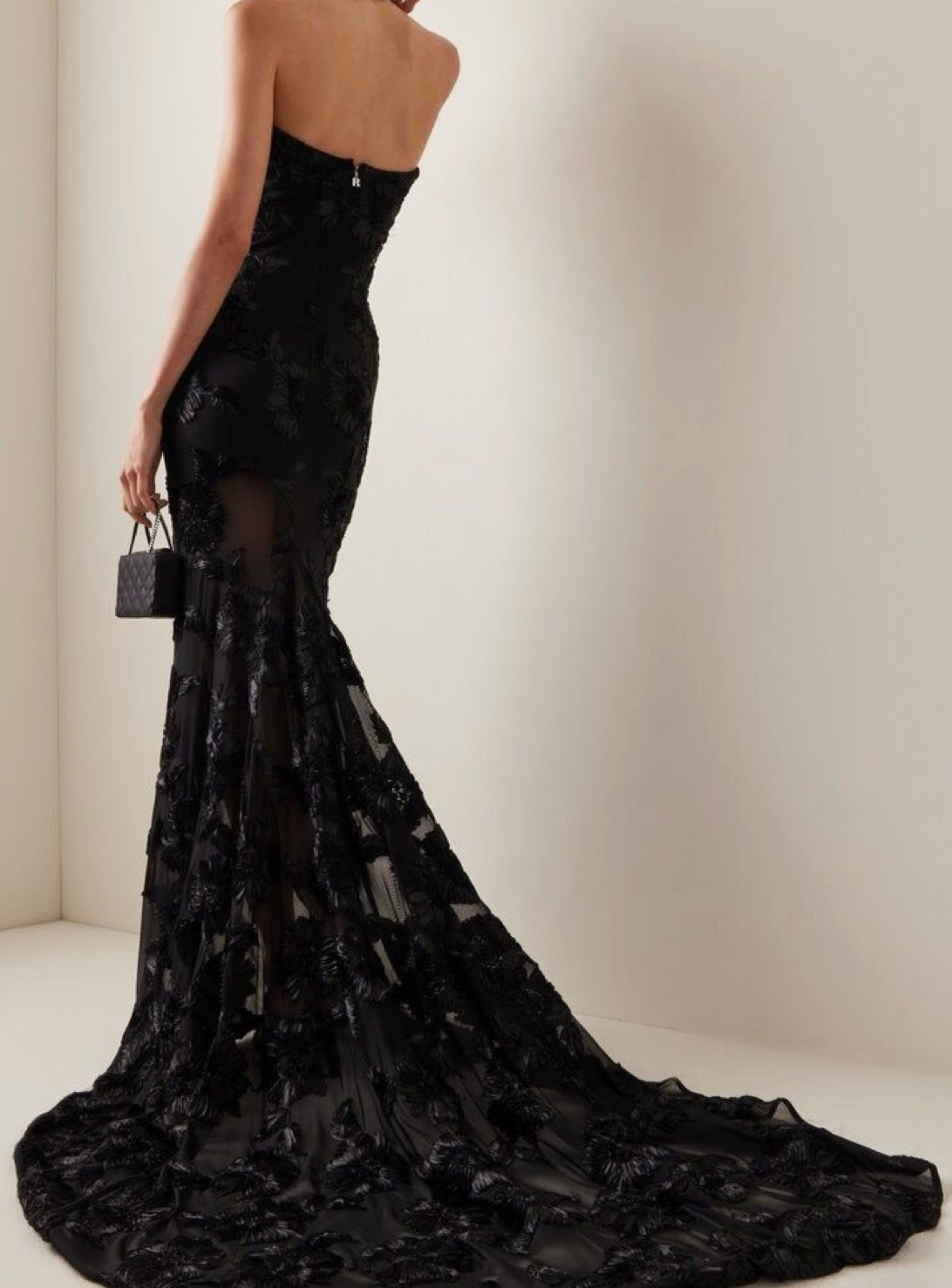 Description: Crafted from delicate 3D floral mesh, the gown features intricate embroidered detailing that adds texture and dimension. The figure-hugging silhouette flatters the body before cascading into a sheer, floor-length skirt with a subtle train, creating an effortlessly romantic look.